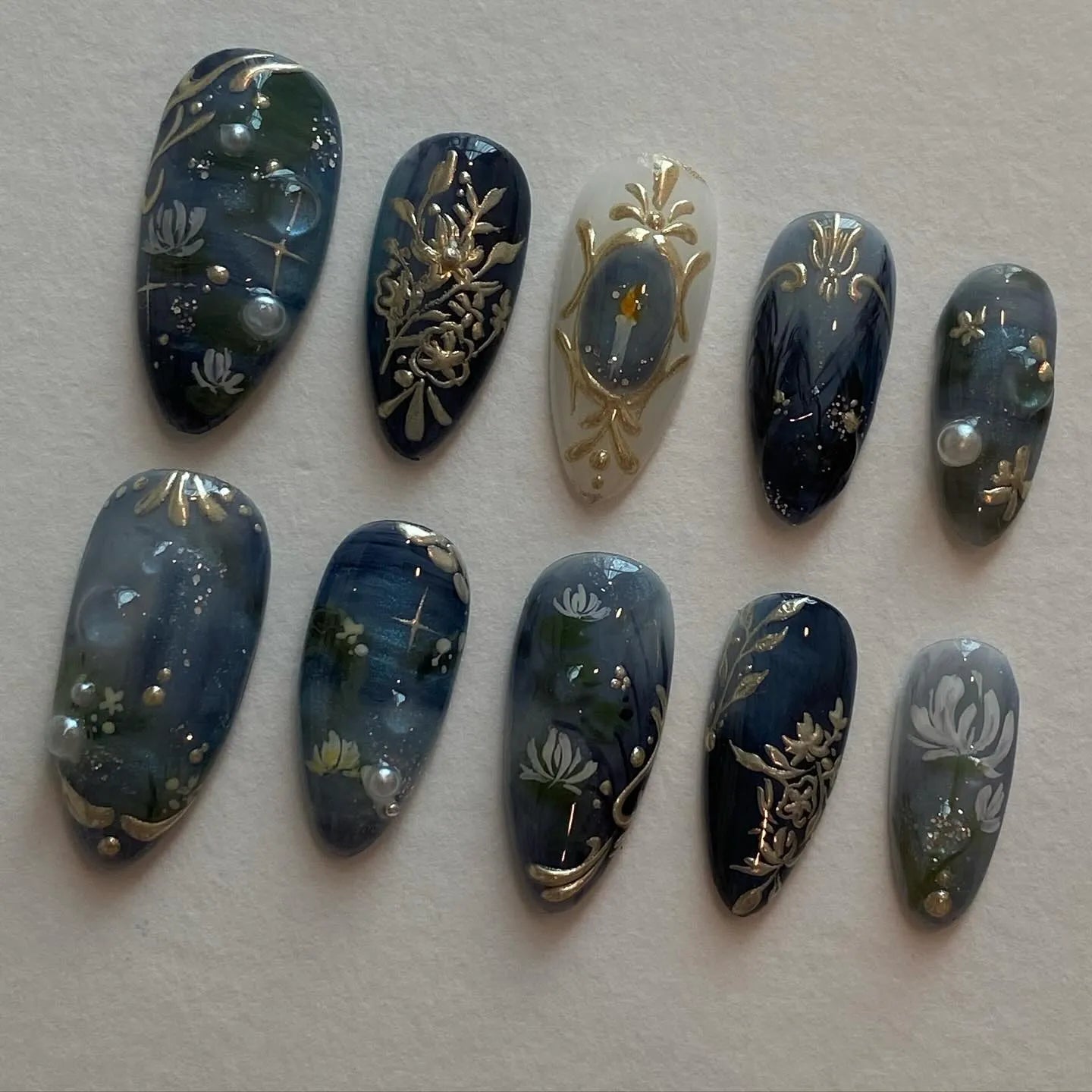 Dive into the tranquility of these artistic handmade press on nails, featuring deep blues, dark greens, and striking water lily pond designs. These reusable designs offer customizable designs and a beautiful high-shine finish, making your fingernails perfect for any event or daily wear. They come in many shapes and lengths, including Medium, Stiletto, or Coffin. Ideal for art lovers, museum visits, or anyone who loves sophisticated, moody, and nature-themed styles. Wear a masterpiece on your hands—claim this unique, stunning set today!