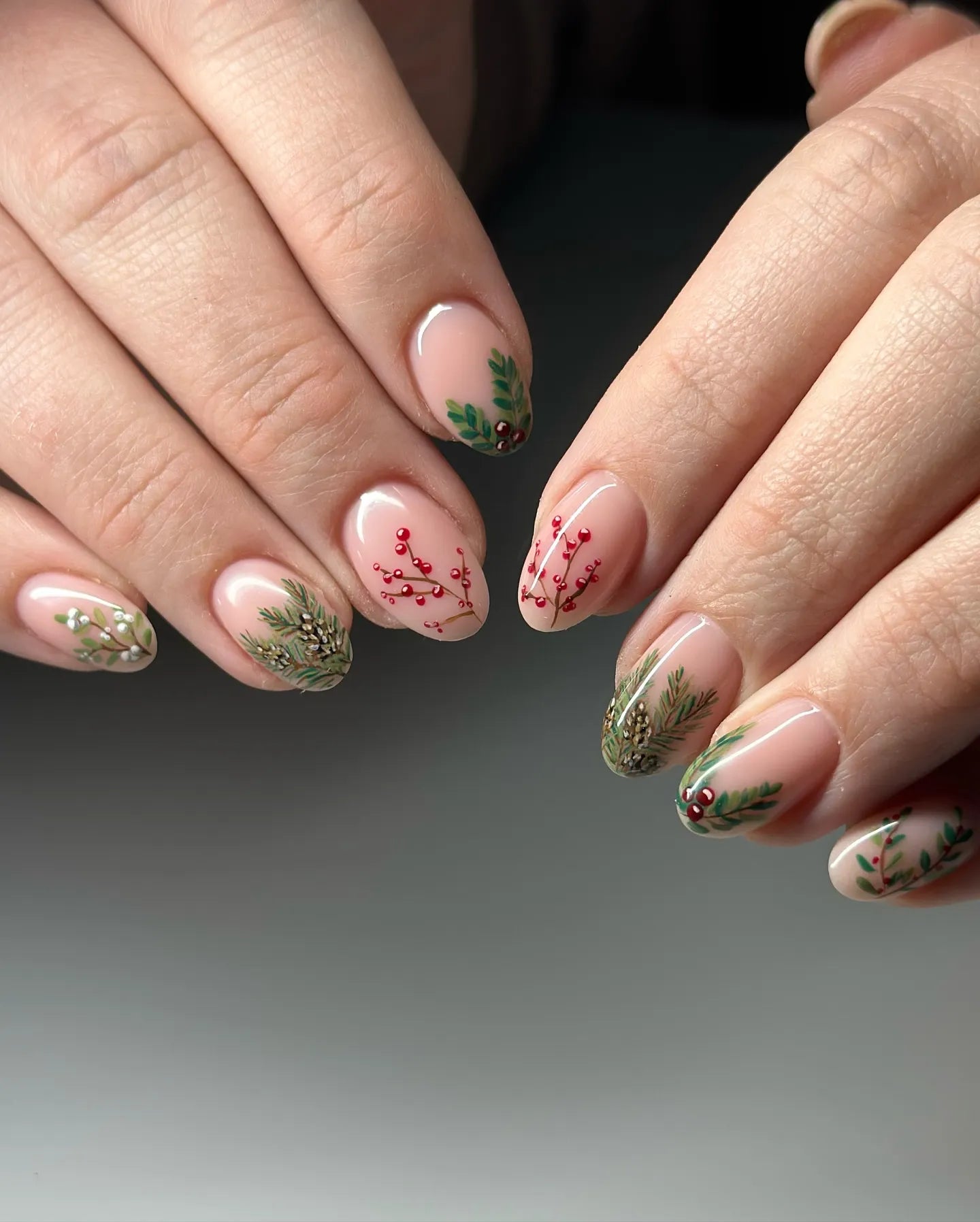 Handmade Delicate Holly Berries Pine Winter Nude Press on Nails H03