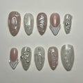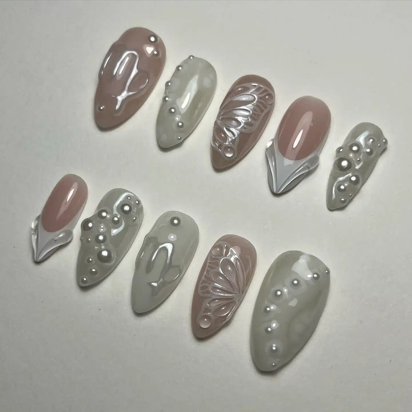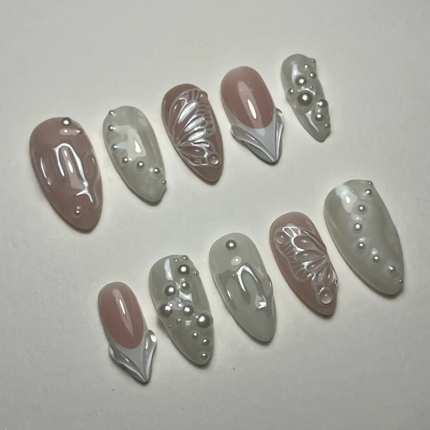 Elevate your elegance with these handmade, reusable press-on nails! Experience timeless beauty with a sophisticated touch. Featuring delicate white, nude pinks, and shimmery pearl accents with a beautiful glossy finish and butterfly details, these nails are perfect for any event or daily wear, especially bridal looks. Get yours now for your special day!
