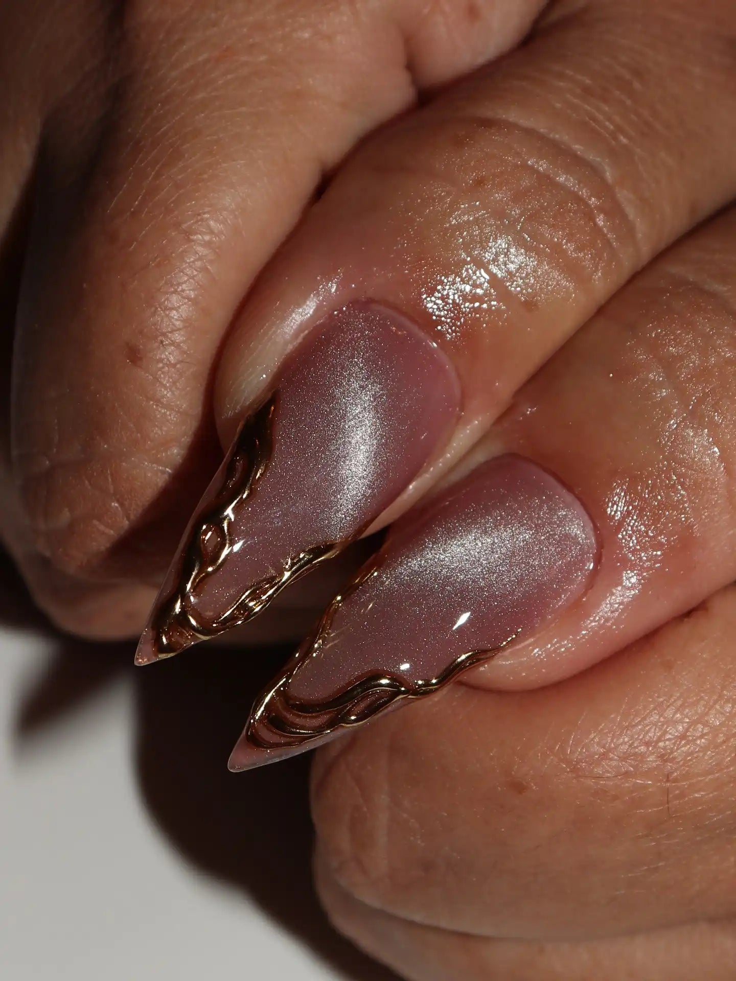 Drip in luxury with these ultra-chic handmade press-on nails, offering customizable designs and a high-shine finish. They are reusable and perfect for parties, runways, or any event or daily wear. Anyone who seeks bold structure and metallic glamour will appreciate the sharp gold chrome outline and shimmering base. Your fingernails will look fiercely elegant! Available in Short, Medium, or Long sizes and shapes like Almond, Coffin, Stiletto, or Oval. Invest in timeless glamour—order this show-stopping set now!