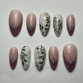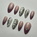 Add a royal touch with these handmade, reusable press-on nails! Experience elegant glamour with intricate details. Featuring deep burgundy, nude, and white with stunning gold leaf, pearl accents, and a smooth glossy finish, these nails are perfect for any event or daily wear, especially formal occasions. Their unique, sophisticated artistry sets them apart. Get yours now and feel like royalty!