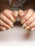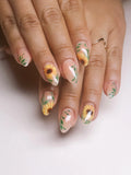 Brighten your style with these stunning handmade press-on nails. Featuring vibrant, hand-painted golden sunflowers and delicate green leaf accents on a natural base, these reusable fingernails offer a customizable, cheerful aesthetic. Their professional glossy finish makes them a beautiful choice for any season. Experience the warmth of a blooming summer garden on your fingertips today!