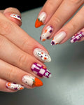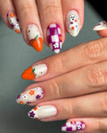 Embrace whimsical style with these unique handmade press-on nails! They feature charming ghosts, playful plaid, and delicate flowers alongside cute pumpkins. Reusable and customizable, these artistic fingernails are perfect for Halloween or adding a spooky-cute touch to daily wear. Available in various shapes and lengths. Get your fun set now!