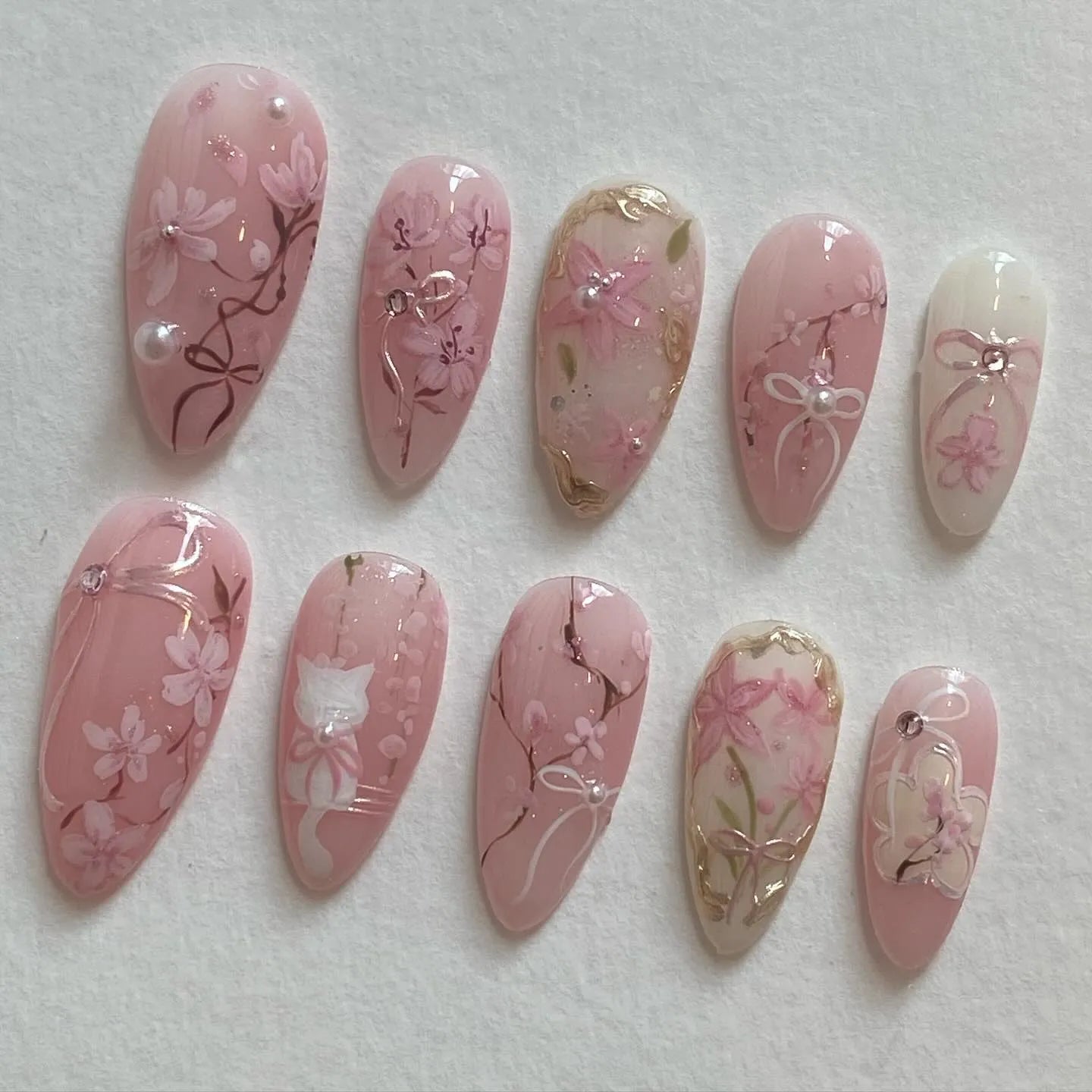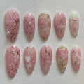 Elevate your fingernails with these delicate handmade press-on nails. Featuring gorgeous hand-painted Sakura blossoms, charming cat accents, and tiny bows, these reusable, customizable designs are perfect for any event or daily wear. Great for spring, weddings, or a lovely date night, they feature a unique, clear finish. Available in many shapes and lengths—like Almond, Coffin, or Stiletto—you'll adore their feminine look. Don't wait to grab this stunning set!