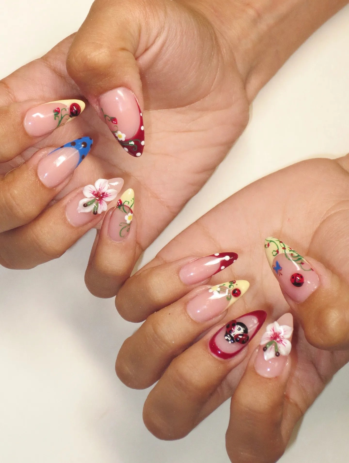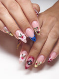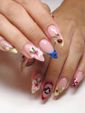 Step into a vibrant garden with these stunning handmade press-on nails. Featuring adorable 3D ladybugs, delicate pink flowers, and elegant white bows, these reusable fingernails offer customizable designs for any joyful event. The playful polka dot accents and professional glossy finish create a unique, eye-catching look. Experience the magic of a whimsical spring garden on your fingertips today!