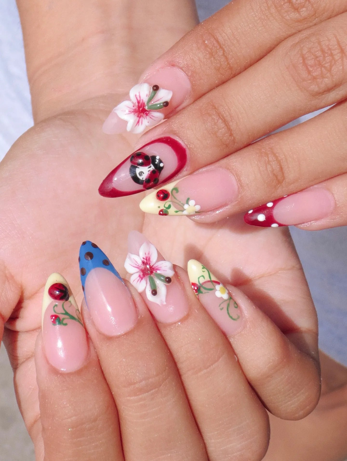 Handmade Ladybug 3D Floral Pink Bow Polka Dot Whimsical Press on Nails A99