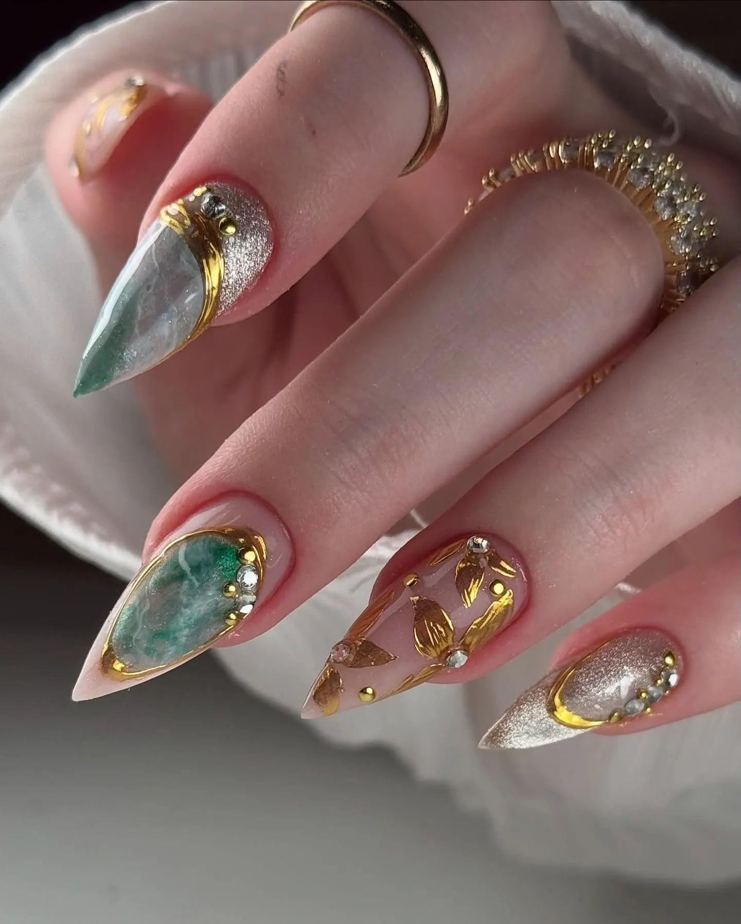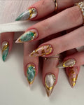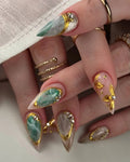 Handmade Luxurious Gold Frame Green Marble Gemstone Floral Accent Press on Nails G50