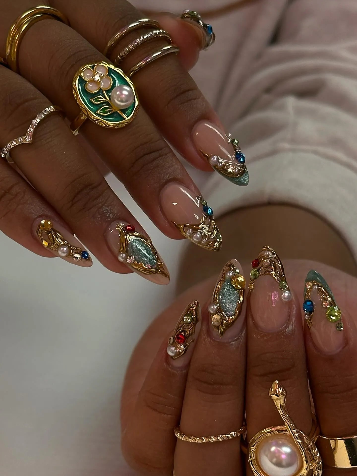 Adorn your fingernails with these jaw-dropping handmade press-on nails! These reusable nails feature dramatic customizable designs with intricate gold sculpting, vibrant jewels, and elegant pearls. They are ideal for costume parties, glamorous nights out, or any event or daily wear. Available in many shapes like Coffin or Almond, and lengths such as Long. This truly unique set offers a lavish, regal look. Own this breathtaking jewelry-inspired set!