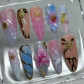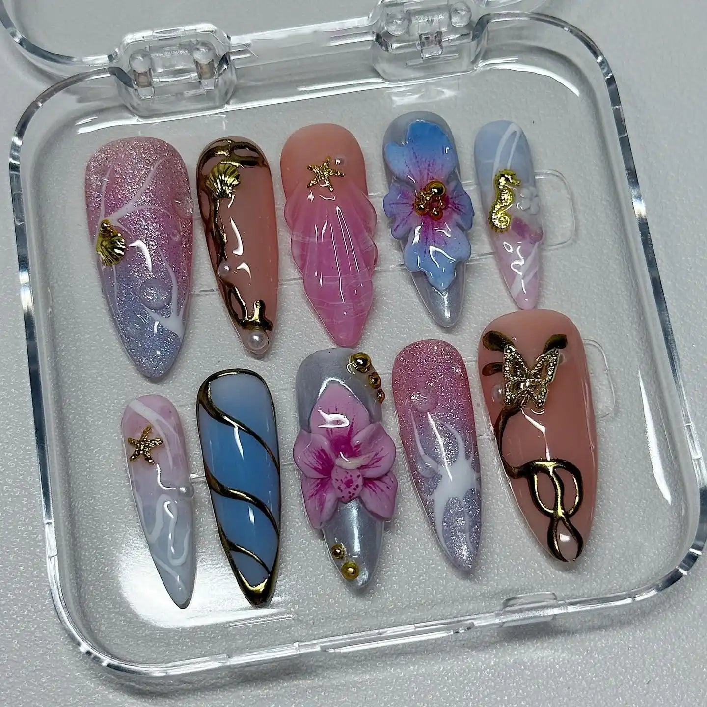 Indulge in an enchanting manicure with these stunning handmade press-on nails! They feature sculpted 3D florals, metallic gold seadragons, and shimmering pastel marble for a captivating glossy finish. These artistic fingernails are incredible for summer vacations, themed photoshoots, or any event or daily wear. They come in customizable designs and shapes like Almond or Coffin. Bring the fantasy of the deep sea right to your fingertips!