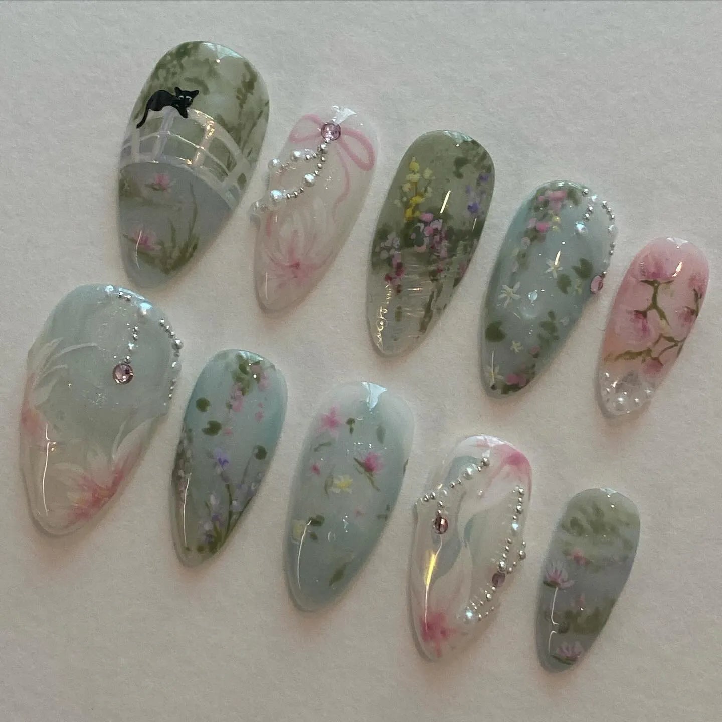 Handmade Monet Garden Cat Water Lily Floral Fairy Press on Nails Y27