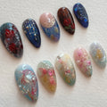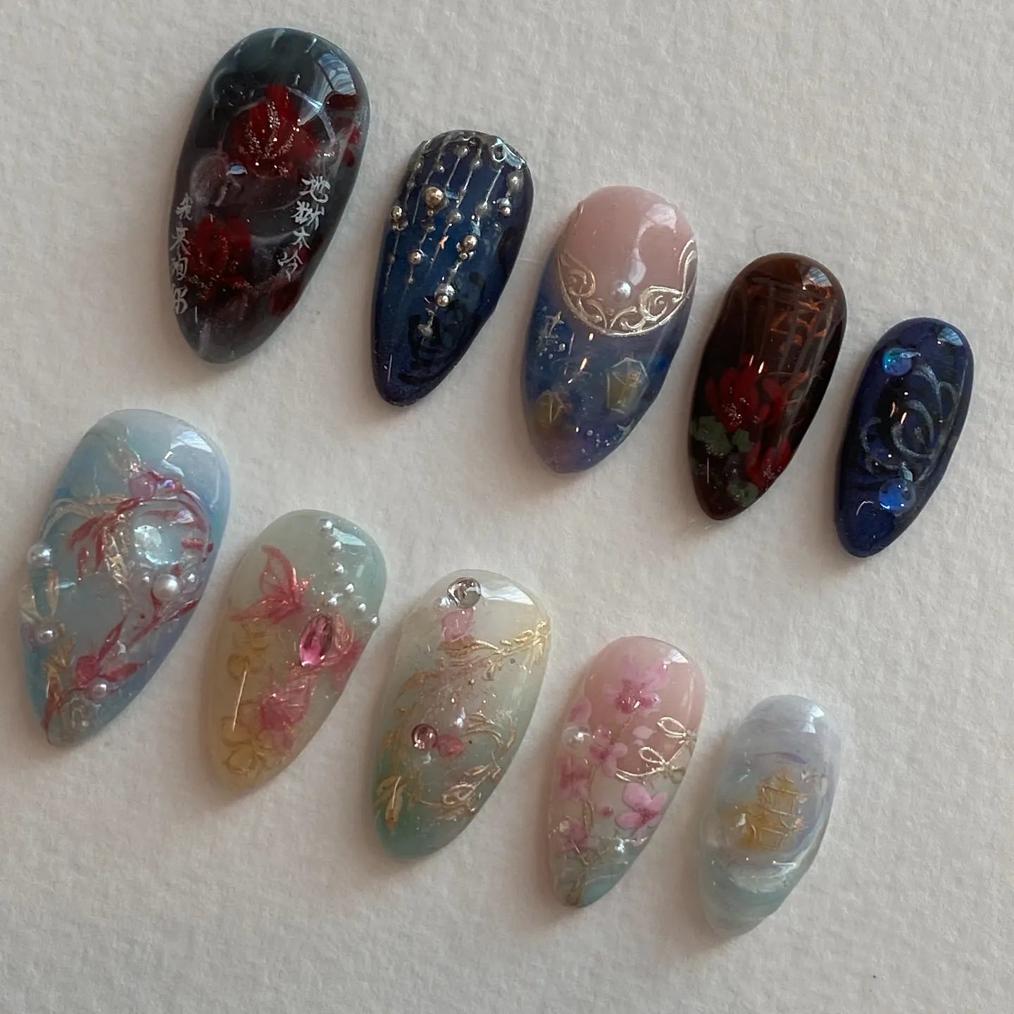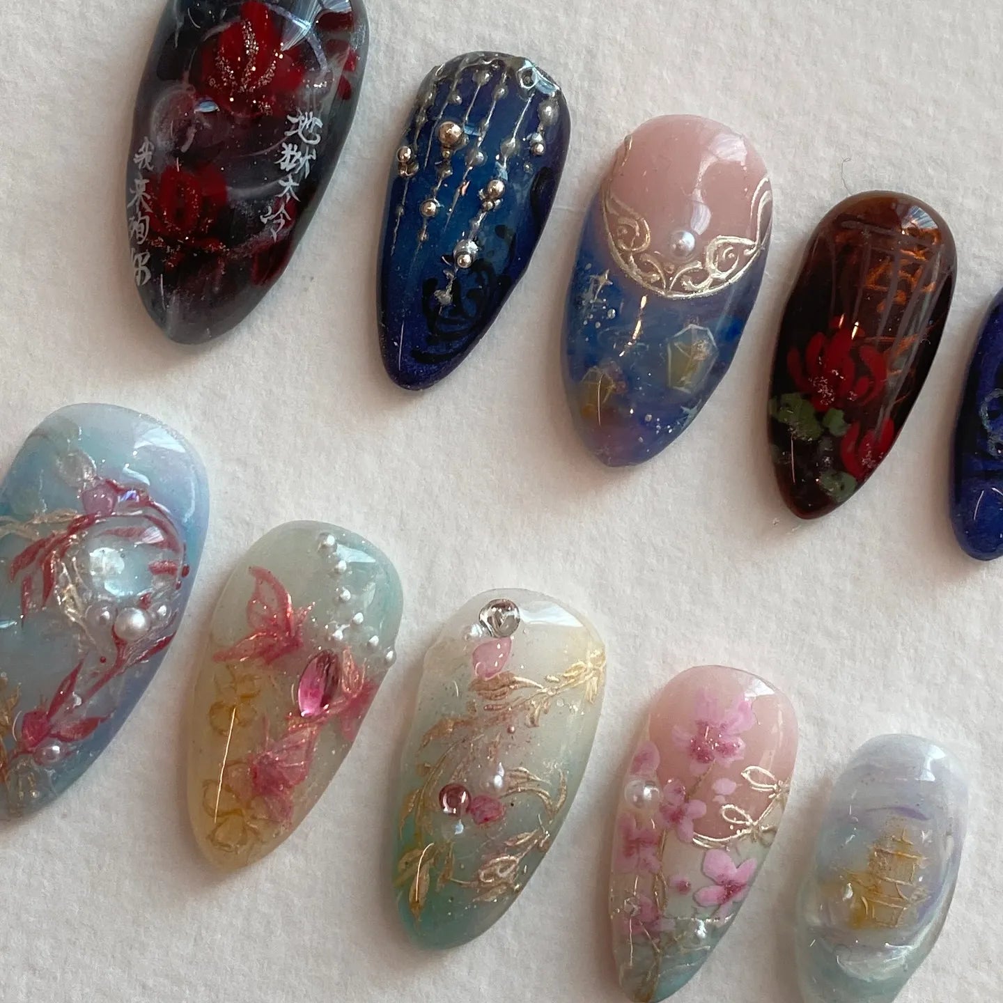 Handmade Mystic Dark Floral Pearl Light Blossom Crystal Elegant Press on Nails Z61