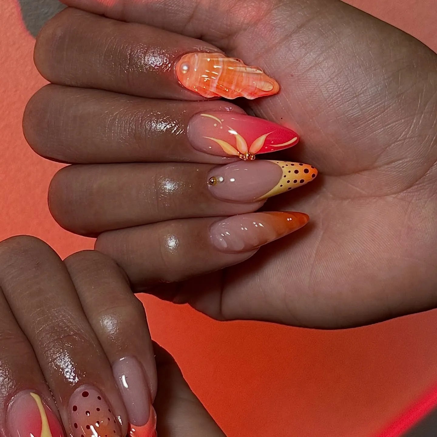 Handmade Neon Orange Pink Butterfly Abstract Summer Press on Nails C72