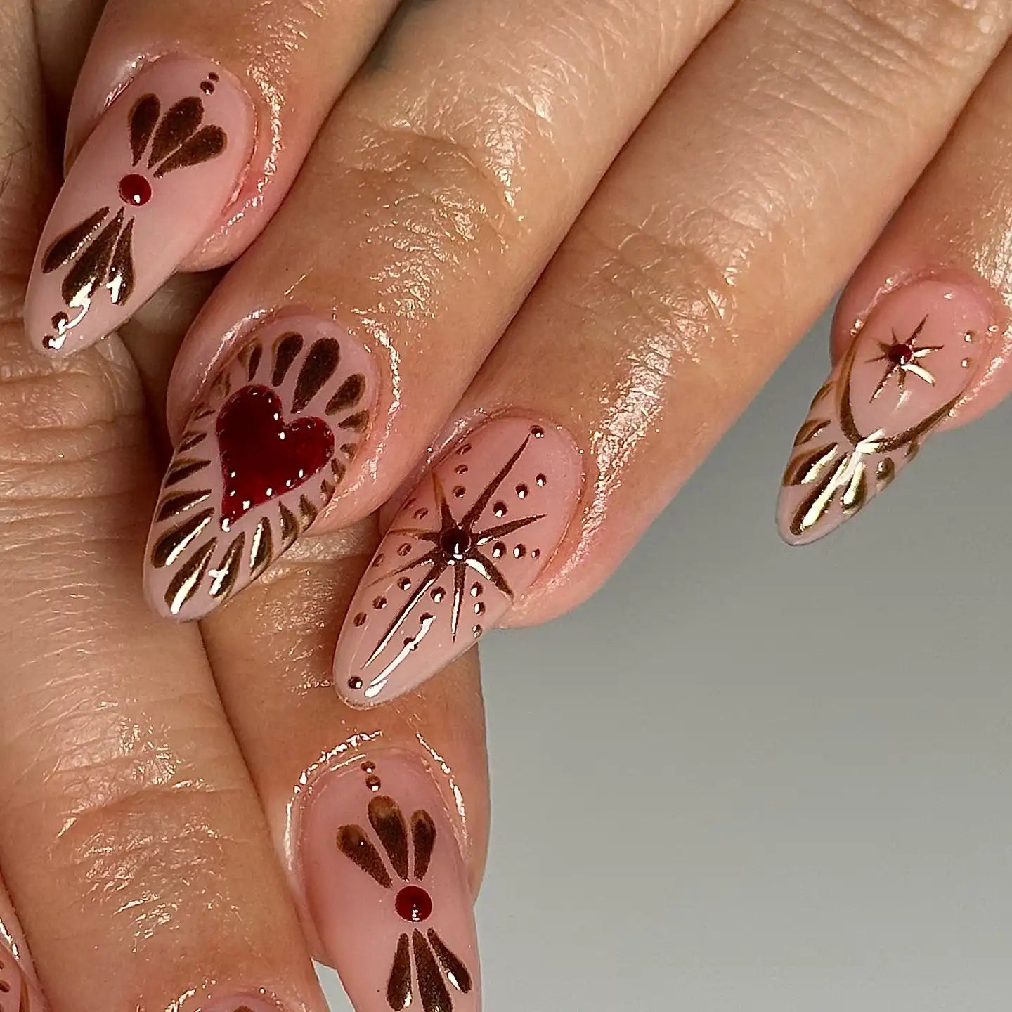 Handmade Nude Red Sacred Heart Gold Chrome Starburst Mystic Press on Nails K53