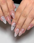 Handmade press-on nails with delicate white snowflakes, silver rhinestones, and fine glitter on a soft nude base. Reusable and customizable in various shapes and lengths like Almond, Coffin, Oval, Square, or Stiletto. Perfect for winter weddings, holiday parties, or daily elegance. Add a touch of frosty sophistication to your style—order yours today!