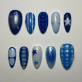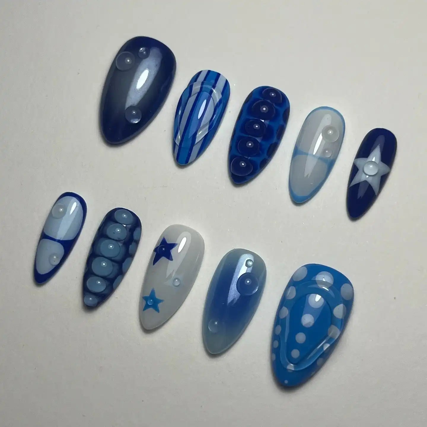 Dive deep into seaside style with these handmade, reusable press-on nails! Enjoy a cool, instant refresh for your look. Featuring various shades of blue, stripes, polka dots, and stars, along with a unique 3D water droplet glossy finish effect, these nails are perfect for any event or daily wear. Shop now and shine!