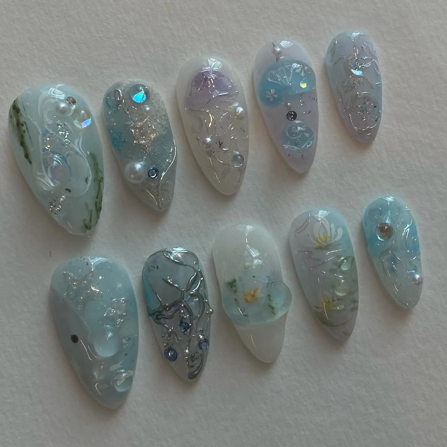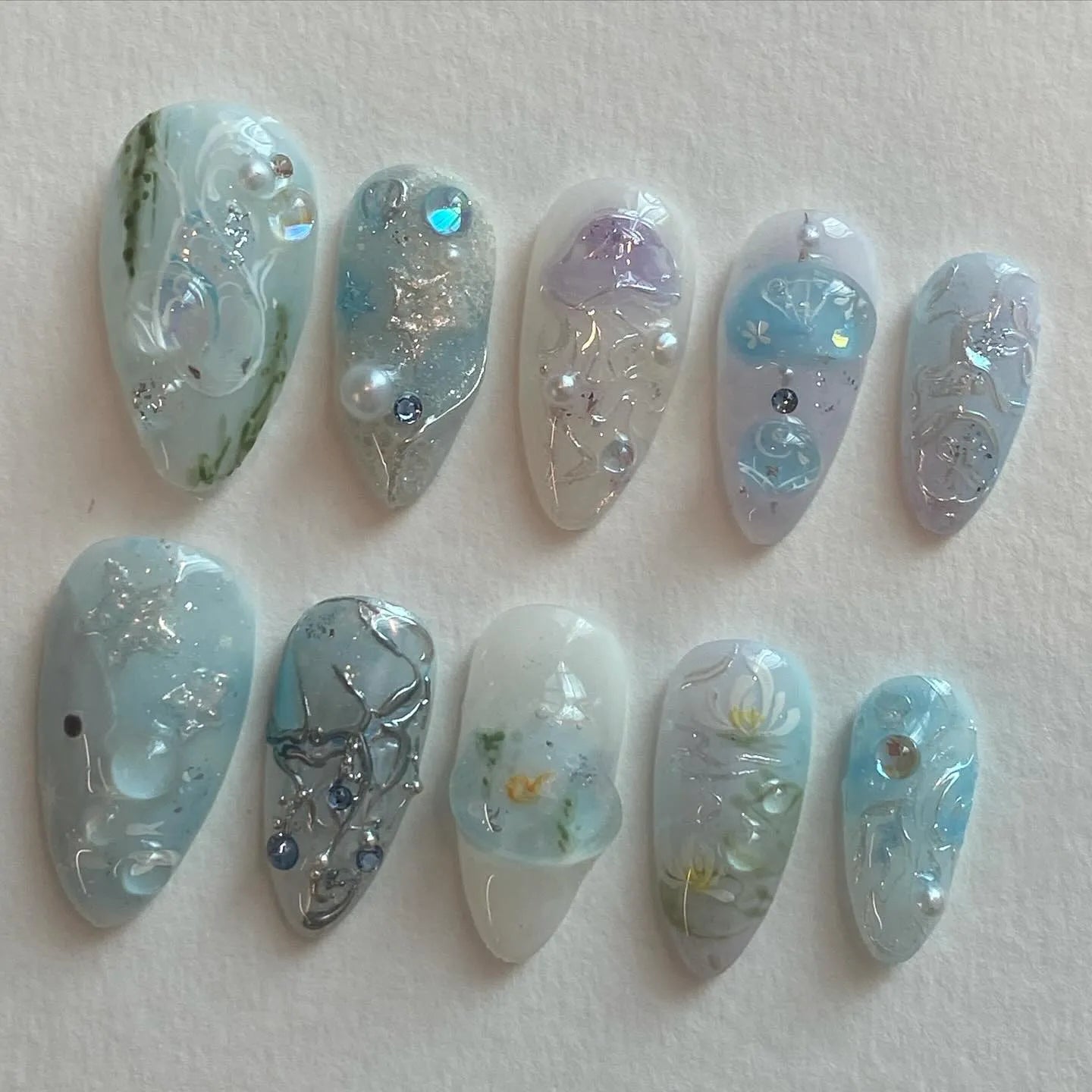 Handmade Pale Blue Ocean Inspired Water Lilies Pearl Fairycore Press on Nails V41