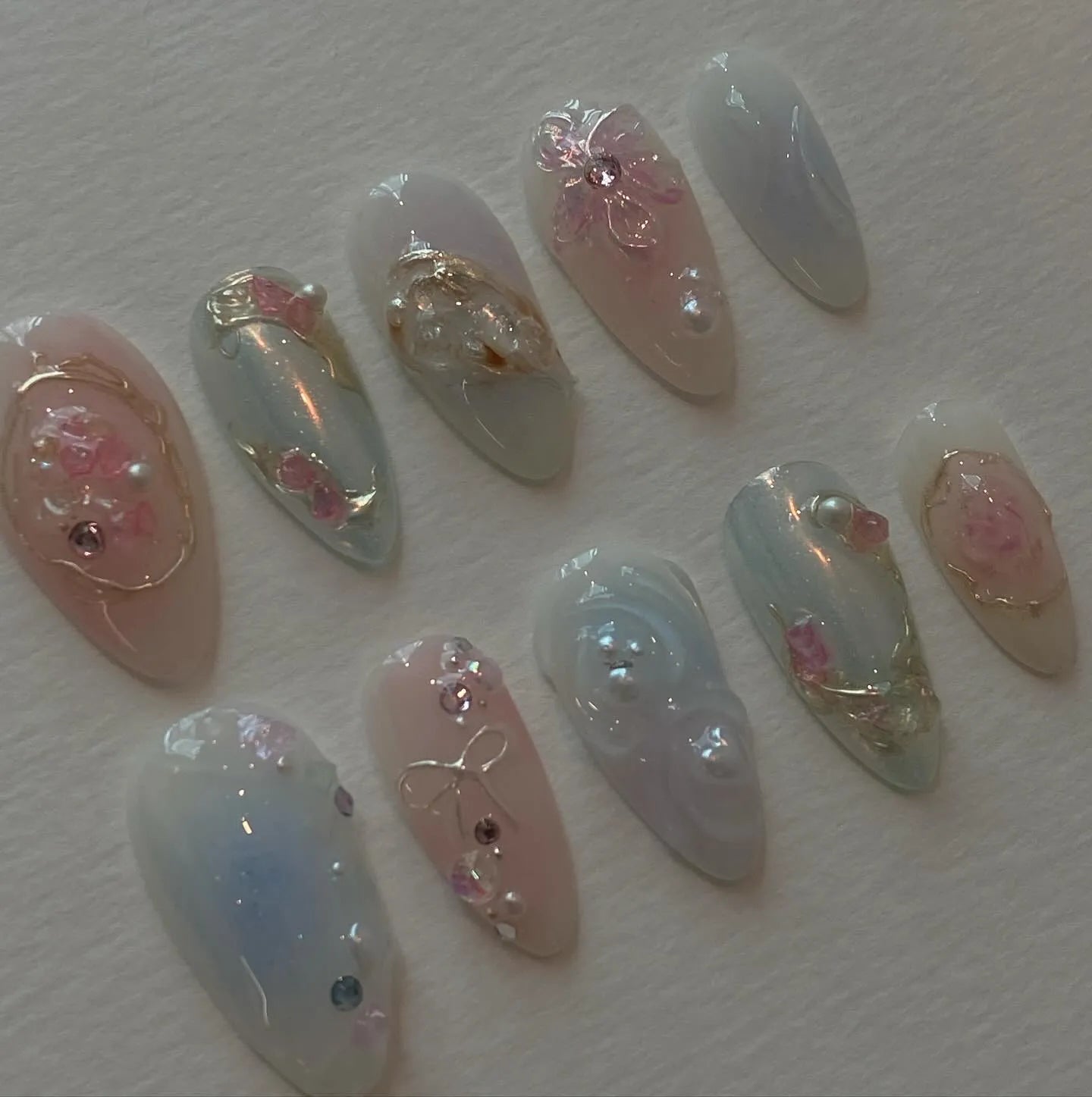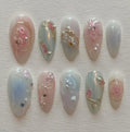 Adorn your fingernails with these exquisite handmade press on nails, featuring a blend of pastel pinks and blues, 3D florals, and shimmering pearl accents. These reusable designs offer customizable designs and a beautiful high-shine finish, making them perfect for any event or daily wear. They come in many shapes and lengths, including Medium, Almond, or Coffin. Ideal for weddings, baby showers, or anyone who loves soft, refined, and whimsical style. Transform your manicure instantly—add this mesmerizing and unique set to your collection!