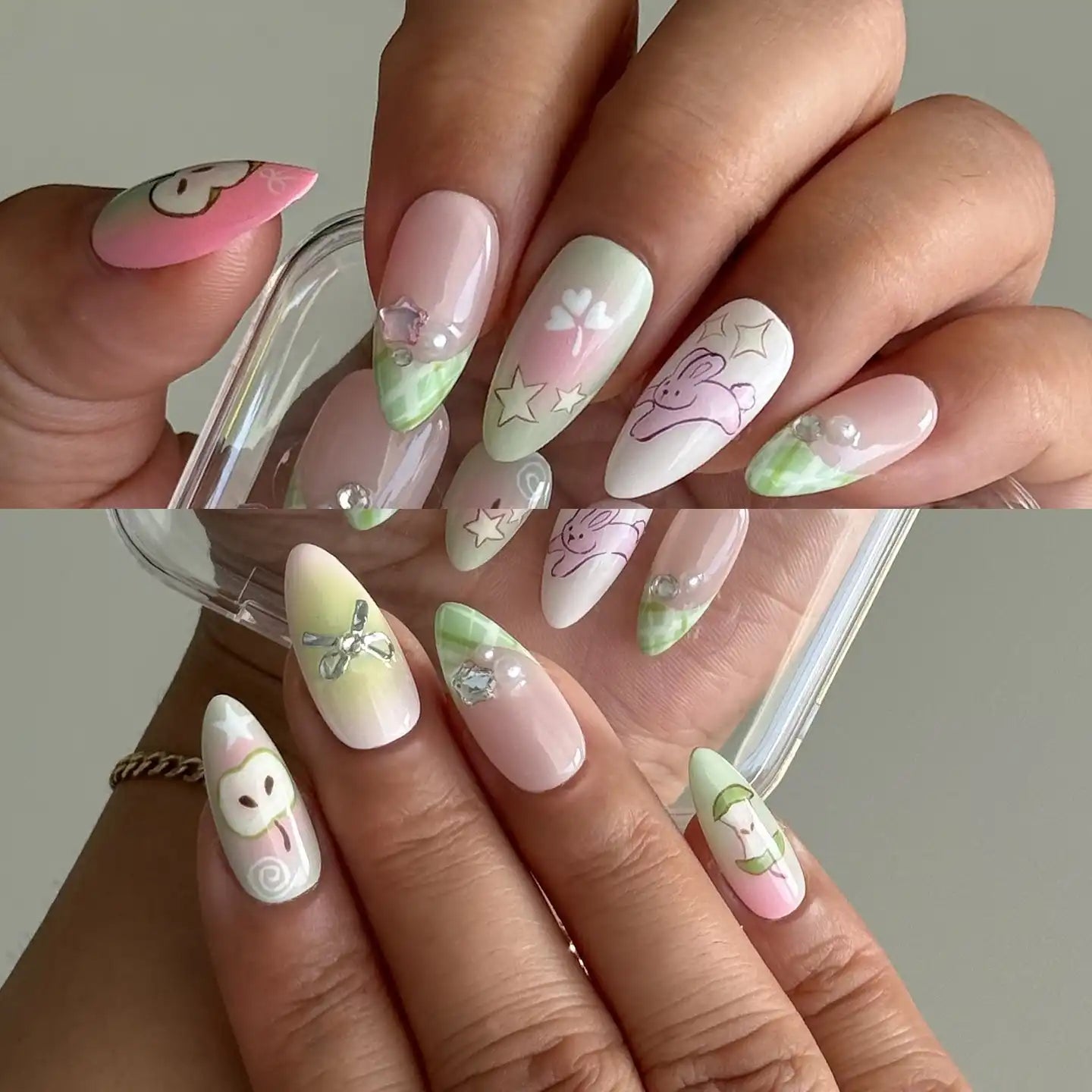 Discover instant charm and flair! These reusable handmade press-on nails feature whimsical pastel pink and green designs like apples, a sweet rabbit, and plaid tips. Perfect for a casual outing or any event or daily wear, they offer customizable designs with a stunning glossy finish. Click to capture this playful, sweet aesthetic for your manicure today!