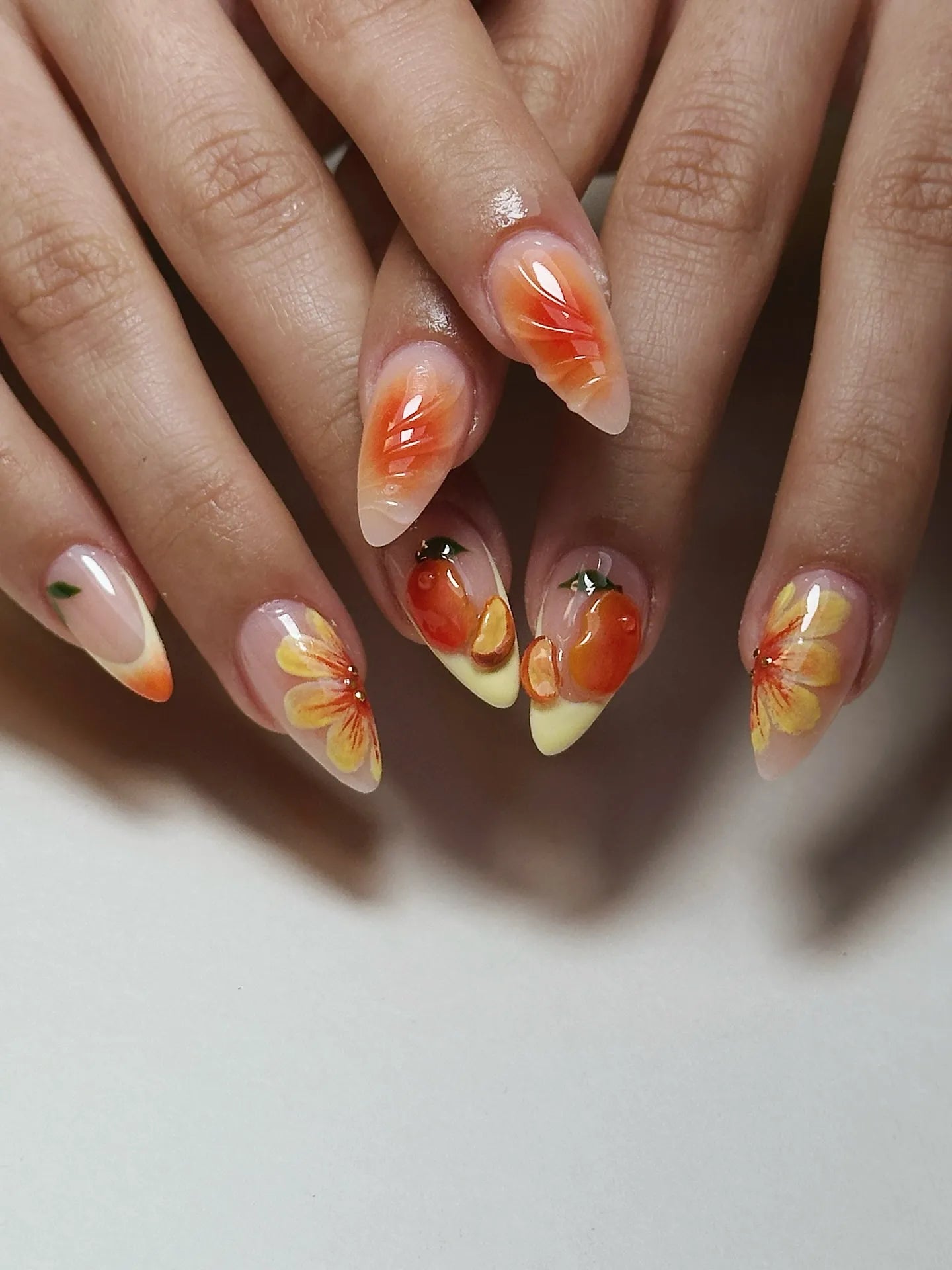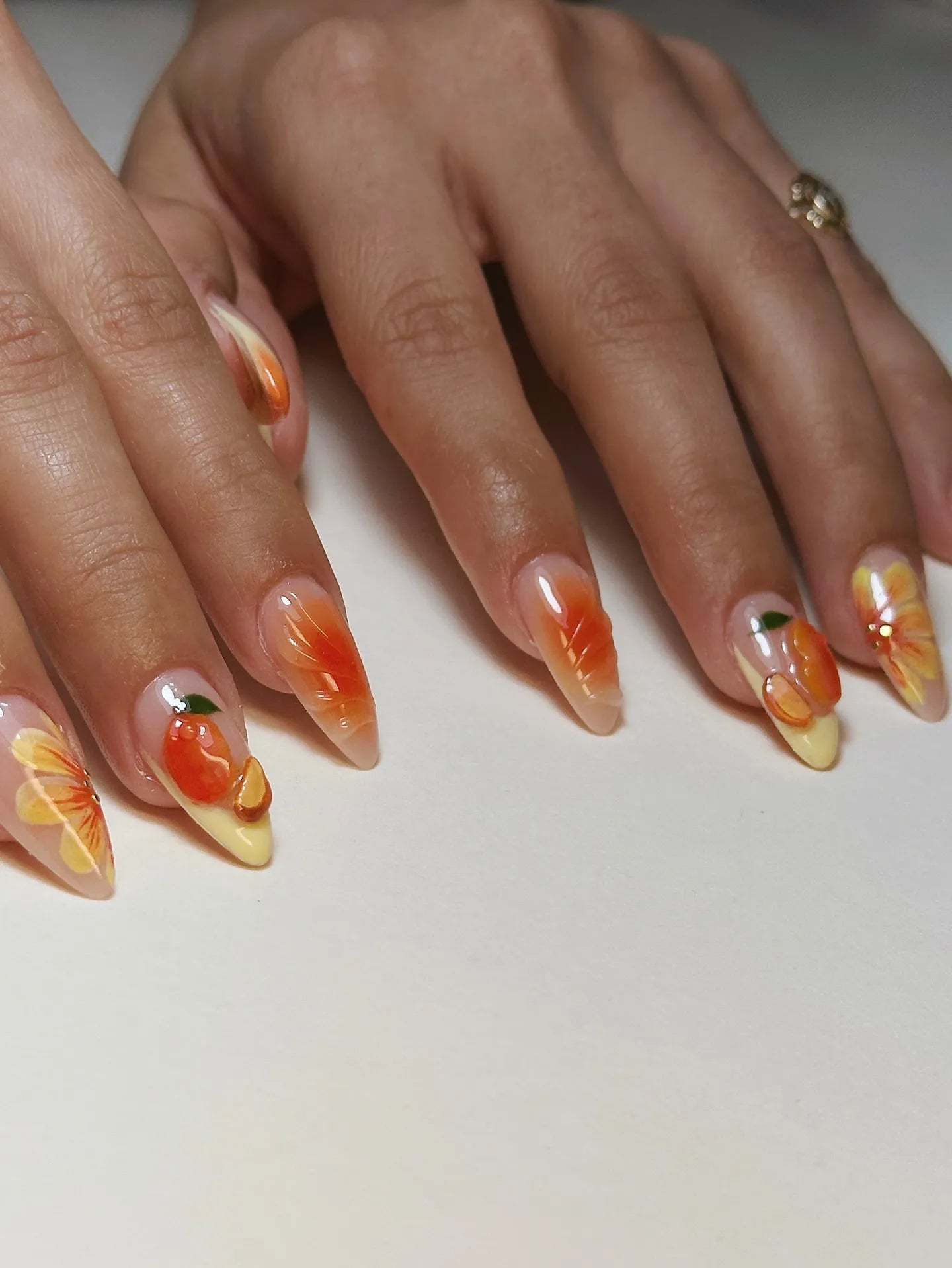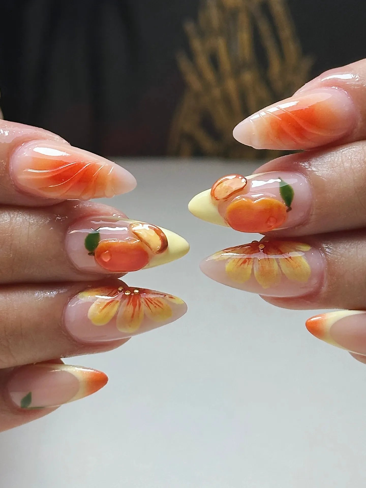 Savor the sweetness of summer with these vibrant handmade press-on nails. Featuring hand-painted peaches, delicate 3D orange florals, and flowing artistic petal designs, these reusable fingernails offer a customizable look for any warm-weather occasion. Their professional glossy finish provides a refreshing, high-end aesthetic. Brighten your manicure with this juicy peach and floral garden set today!