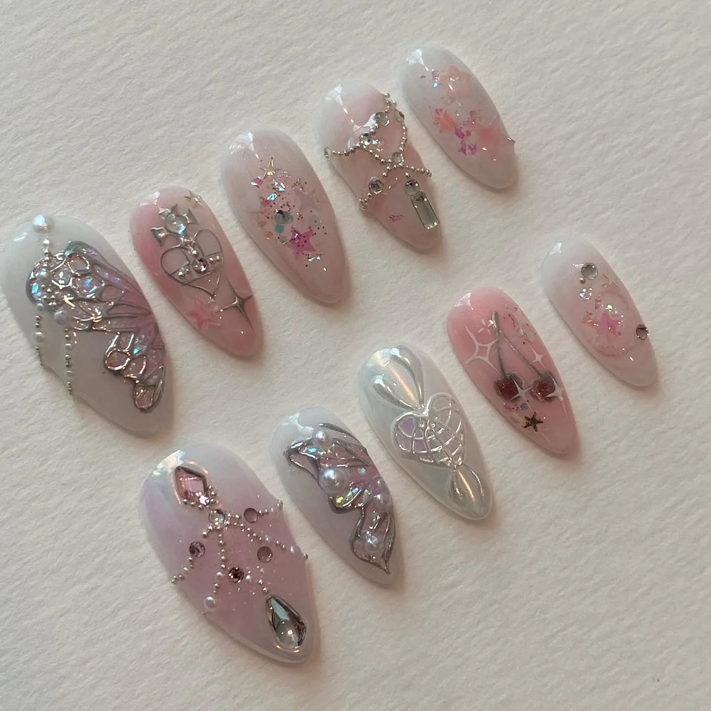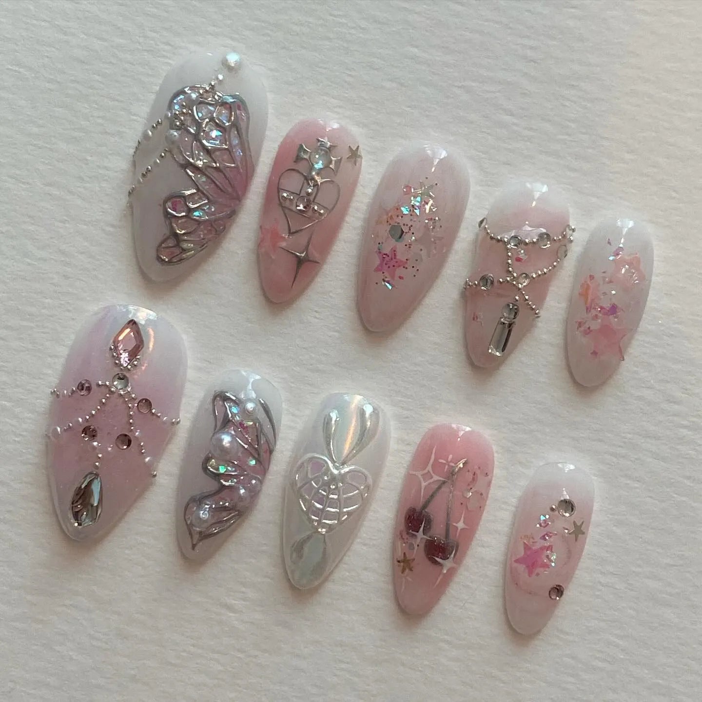 Handmade Pink Butterfly Silver Chrome Cherry Heart Fairy Fake Nails N62
