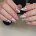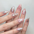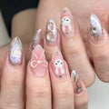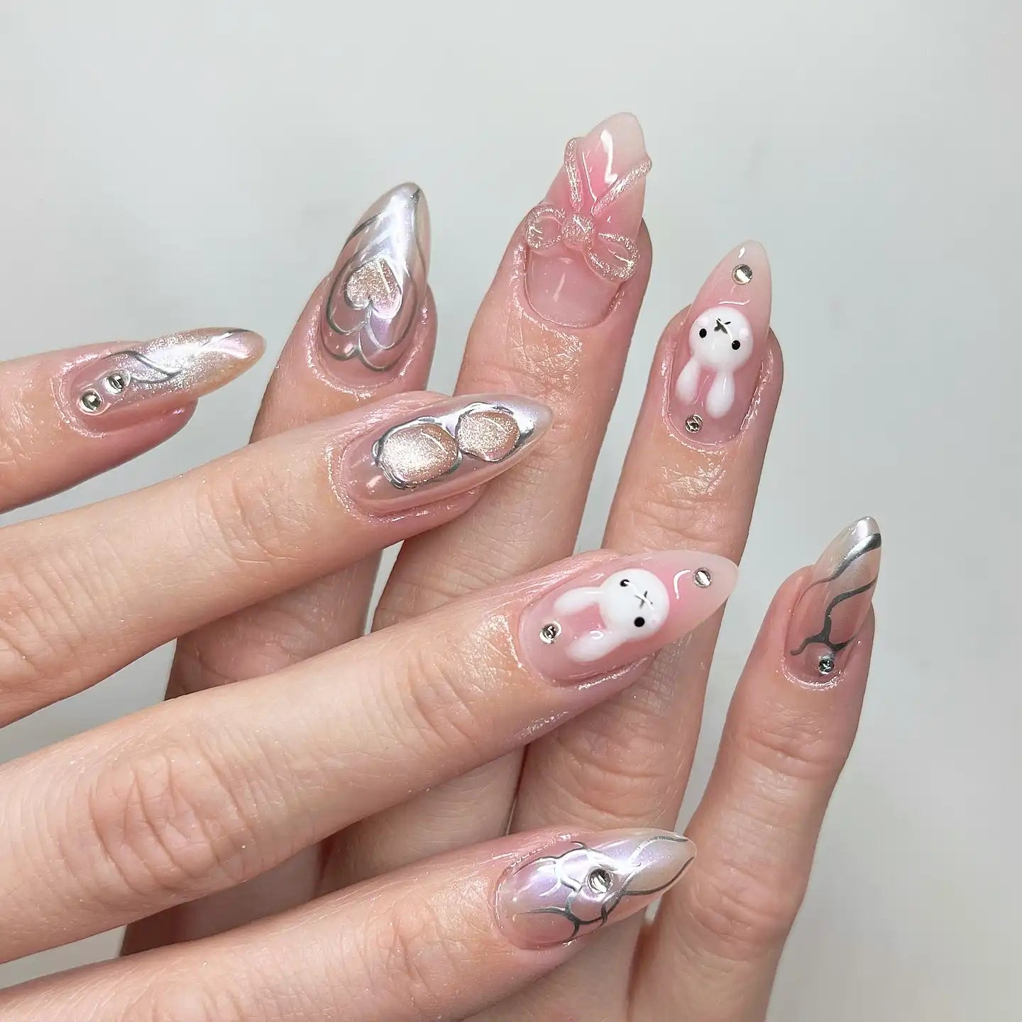 These handmade press-on nails are pure kawaii charm with 3D bunny faces, sparkling bows, chrome hearts, and iridescent pink shimmer. Perfect for birthdays, selfies, dates, or daily cuteness, each nail has a glossy finish and comes in customizable, reusable shapes and lengths. Designed for pastel lovers, soft-girl aesthetics, and playful trendsetters, these nails turn your fingertips into a sweet style statement. Order now and let your nails hop into adorable, eye-catching fun!
