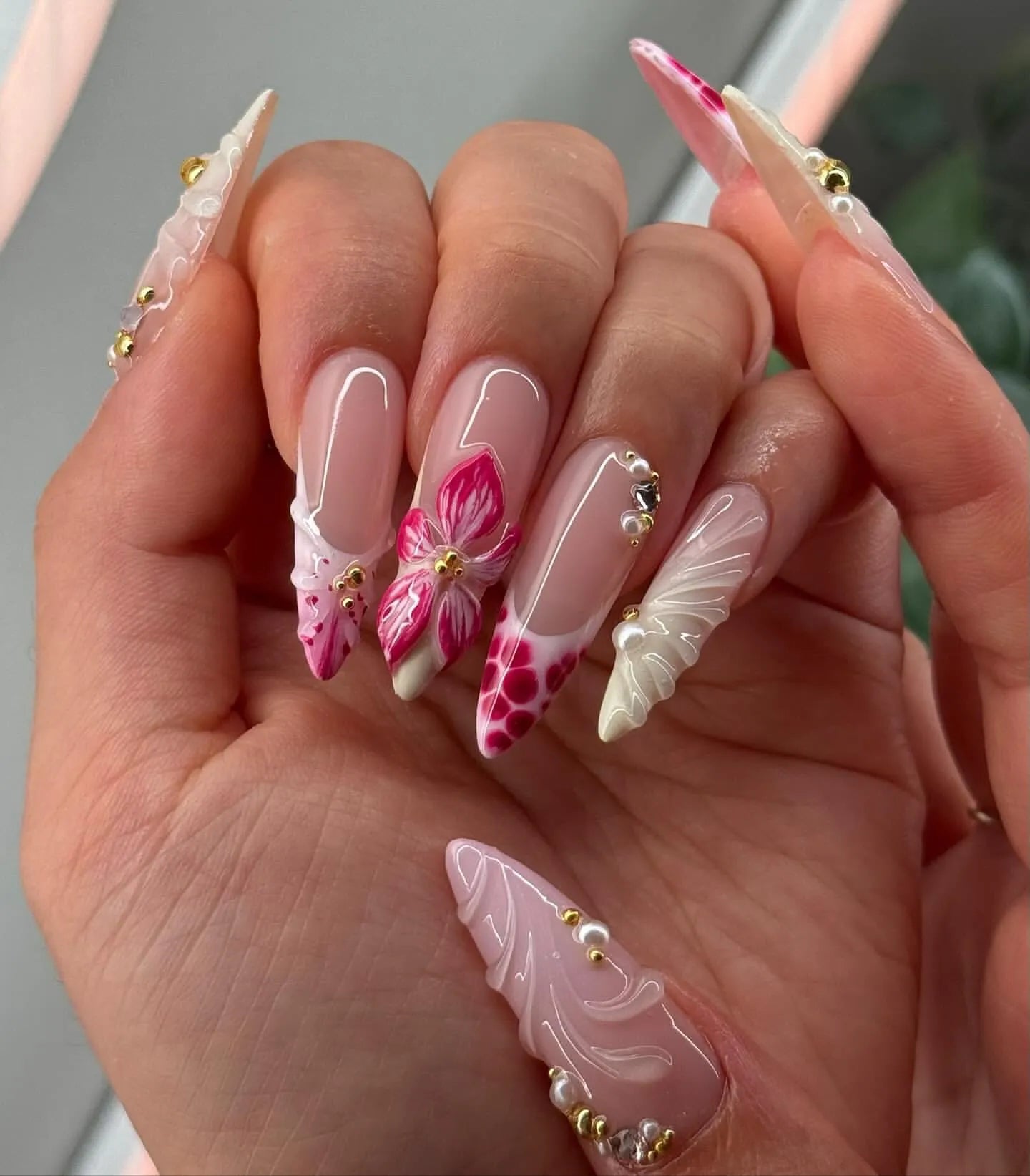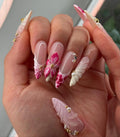 Discover instant elegance with these exquisite handmade press-on nails. Adorned with delicate 3D pink flowers and a glossy finish, they offer a unique flair. These reusable nails feature customizable designs and are available in various lengths like Short, Medium, or Long, and shapes such as Almond or Stiletto. Ideal for a romantic date or any event or daily wear. Make these stunning fingernails yours!