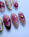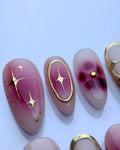 These handmade press-on nails feature a gentle pink and nude gradient with floral and star designs, enhanced by gold geometric accents and pearls for a refined look. Reusable and available in shapes like Oval or Square, and lengths such as Short or Medium, they’re ideal for brunches or daily wear. Chic trendsetters will love their glossy finish—shop now and add a touch of elegance!