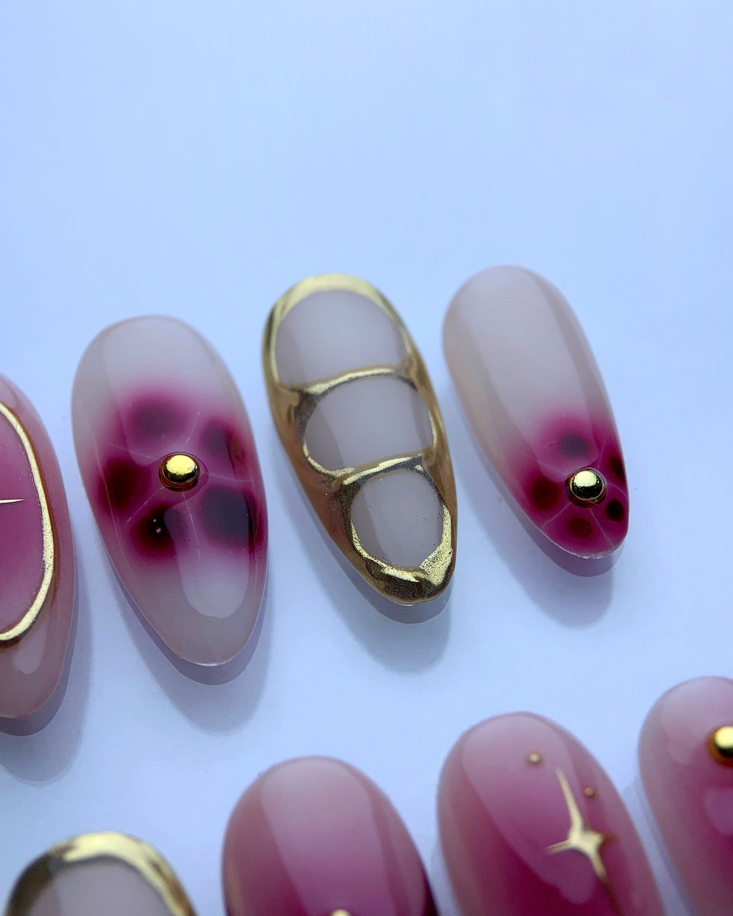 Handmade Pink Floral Star Nail Art with Gold Pearl Accent Press on Nails H20