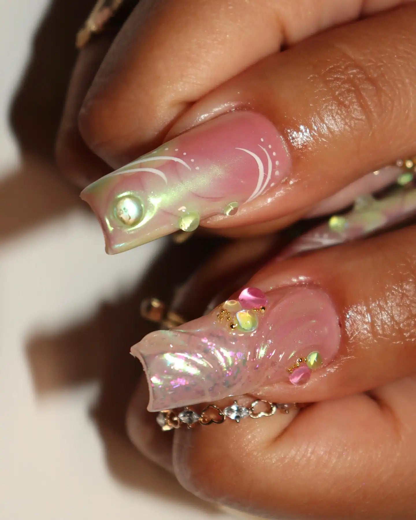 Make a maximalist statement with this extravagant set of handmade press-on nails. The intricate 3D flower, chrome texture, and iridescent swirls create a captivating look, great for a major holiday or fashion moment. These reusable art pieces deliver a brilliant glossy finish for your fingernails. This unique blend of textures is perfect for any event or daily wear! Get ready to turn heads—purchase this stunning set now!