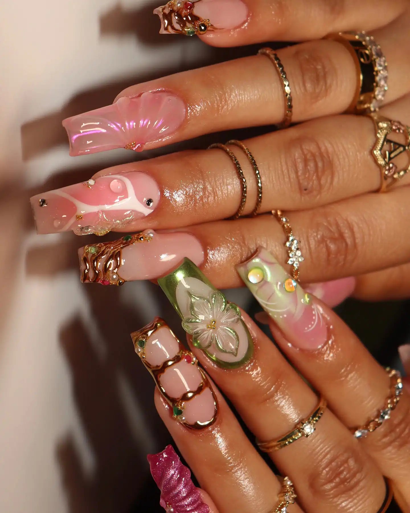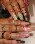 Handmade Pink Green White 3D Flower Chrome Press on Nails V48
