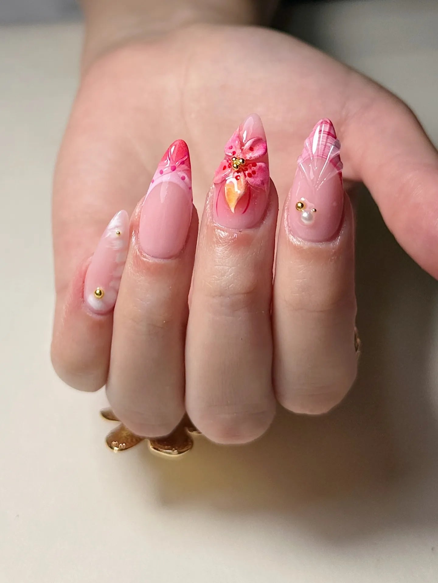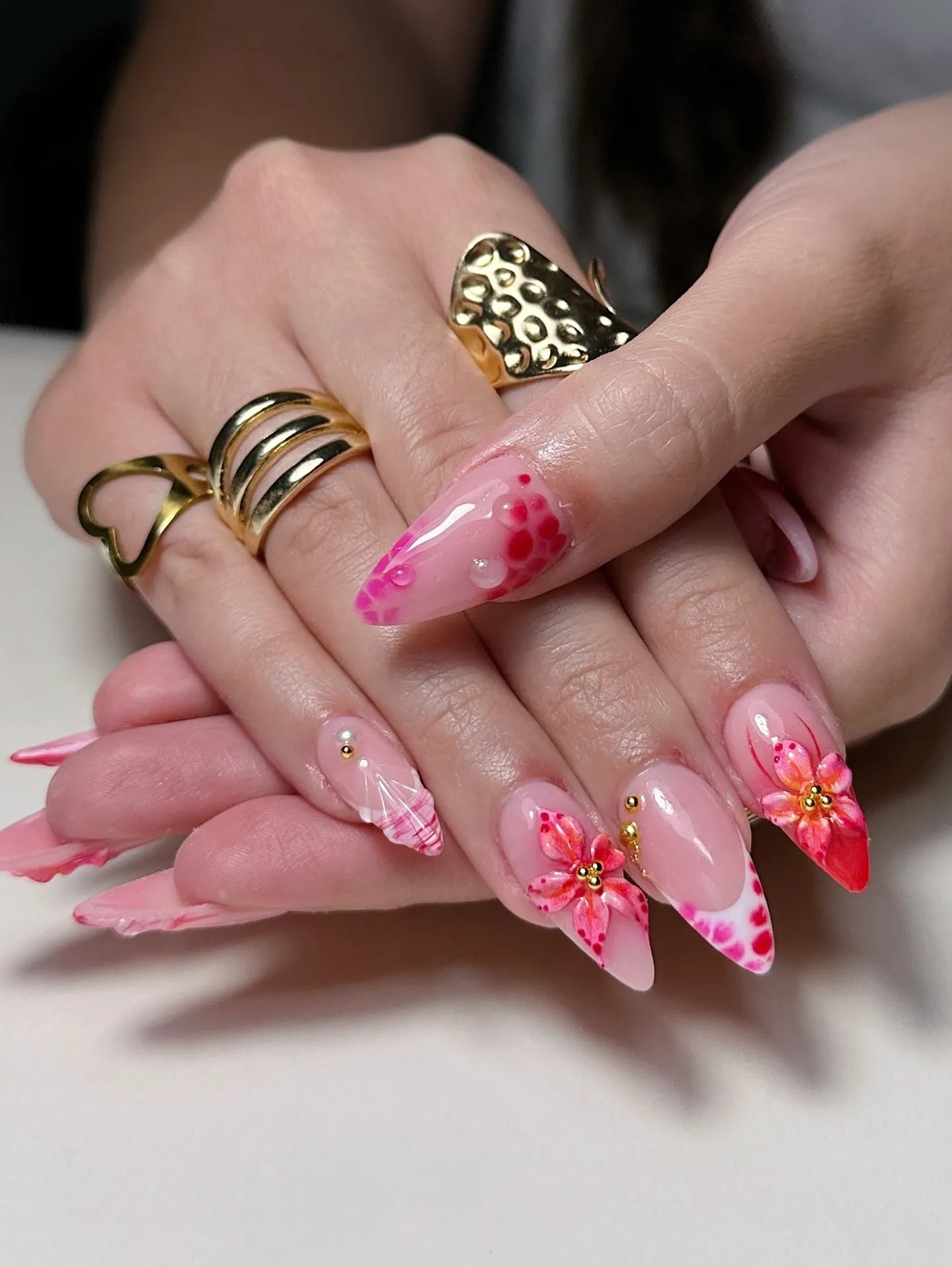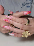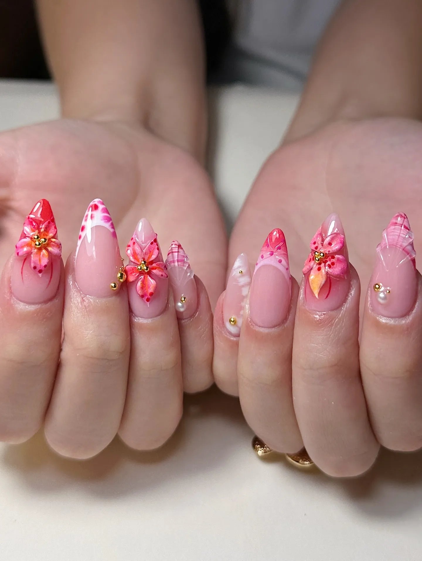 Elevate your summer style with these stunning handmade press-on nails. Featuring vibrant pink hibiscus art, exquisite 3D floral charms with gold centers, and delicate seashell textures, these reusable fingernails offer a customizable, high-fashion tropical look. Their professional glossy finish and pink patterned French tips are perfect for any vacation. Bring a touch of island paradise to your fingertips today!