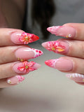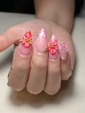 Handmade Pink Hibiscus 3D Tropical Floral Seashell French Tip Press on Nails K85