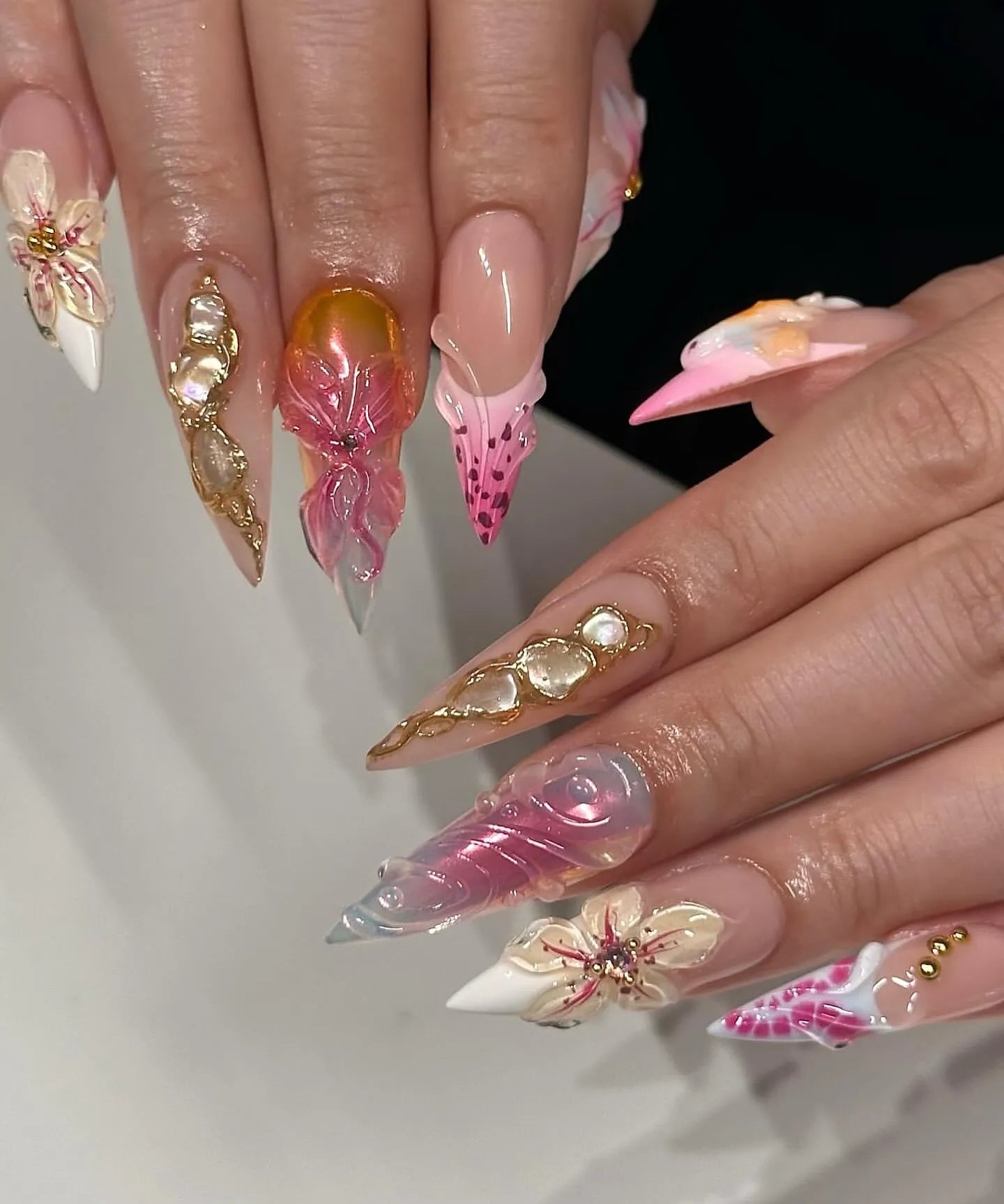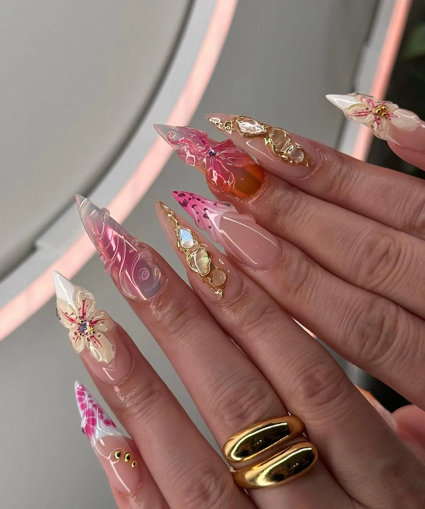 Handmade Pink Holographic Sculpted Butterfly Gold Foil Press on Nails A93