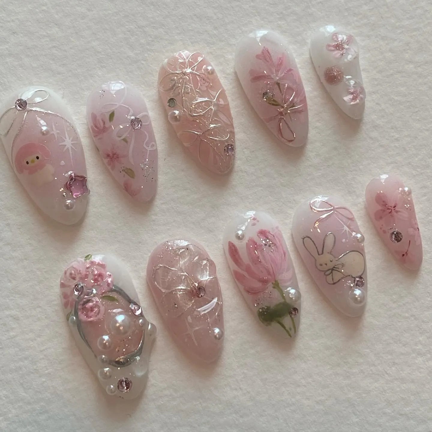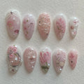 Adorn your fingernails with these exquisite handmade press on nails, featuring soft pink florals, sweet character accents, and shimmering pearls. These reusable, beautiful nails offer customizable designs and are perfect for any event or daily wear. Who would love these? Anyone who adores Kawaii style, cottagecore, or pastel aesthetics. Embrace this stunning, high-shine finish! Order your adorable set today and let your nails bloom with charm!