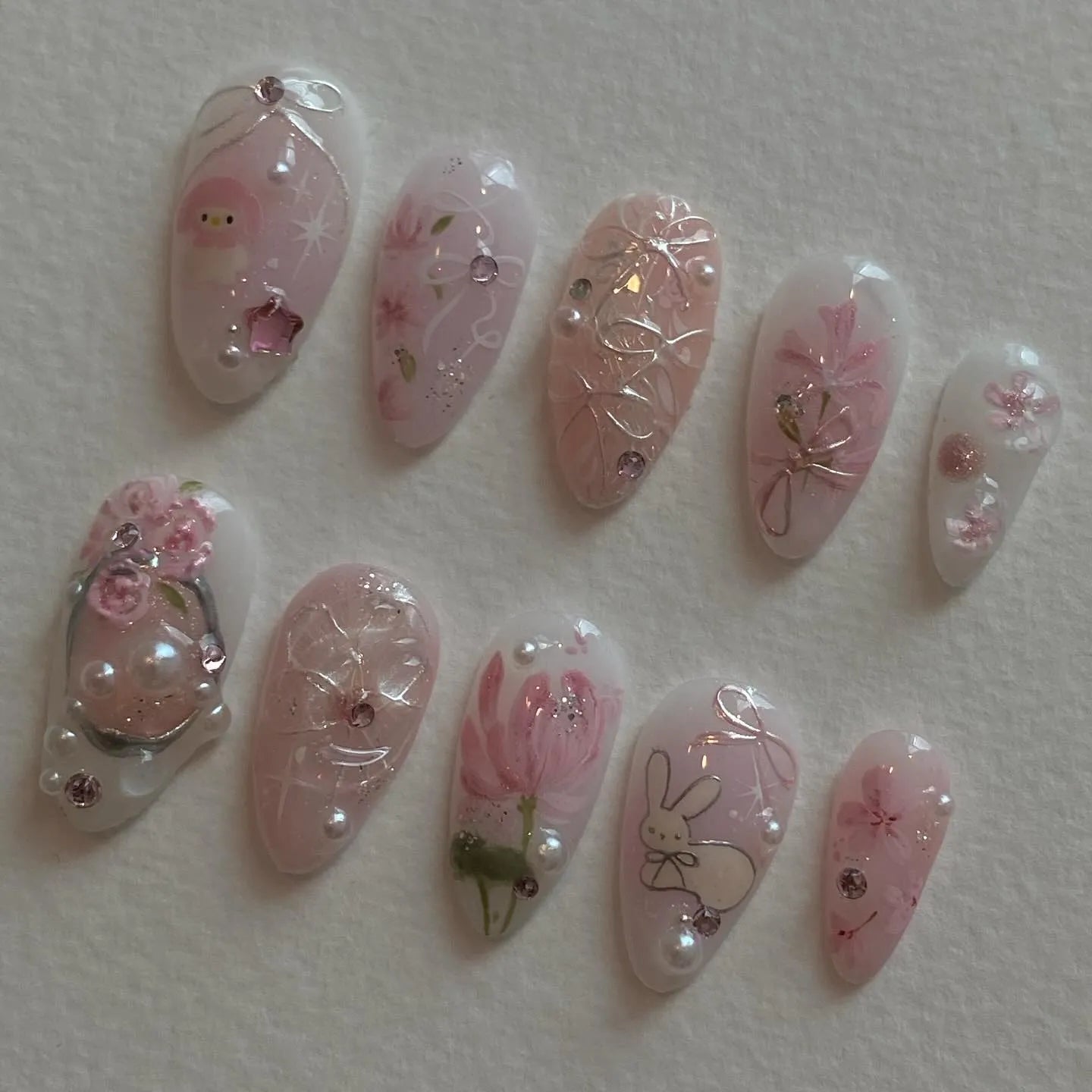 Handmade Pink Kawaii Character Floral Press on Nails B88