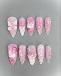 Step into a world of romance with these adorable handmade press-on nails. Featuring 3D bows, roses, and lace-up details over a soft pink base, these are great for a baby shower, romantic date, or special Spring occasion. This beautiful set for your fingernails is reusable and features a lovely glossy finish. Explore our wide array of customizable designs, including shapes like Stiletto, Almond, or Oval, and lengths such as Long, Medium, or Short. Perfect for any event or daily wear! Get your feminine fairytale look—order this dreamy set now!