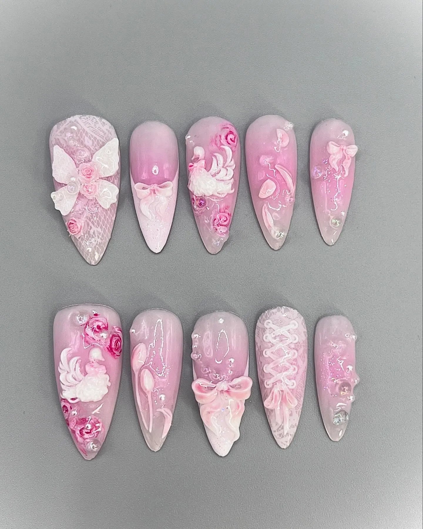 Handmade Pink Lace Bow Rose Swan Coquette Ballerina Core Press on Nails P09