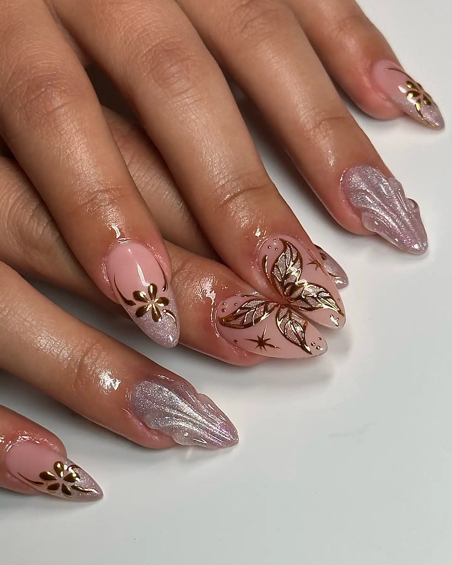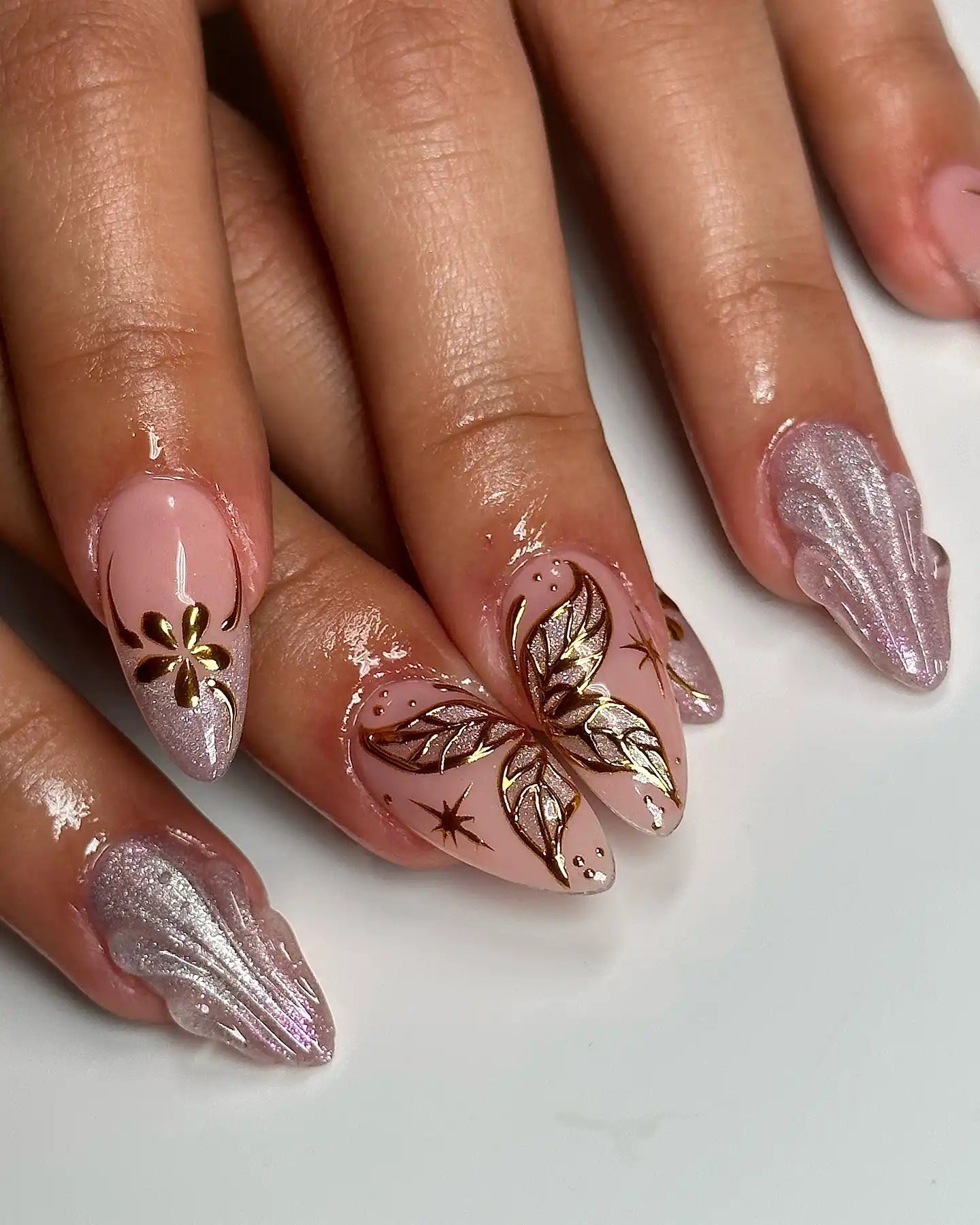 Handmade Pink Nude Butterfly Gold Chrome Fairy Dust Press on Nails U97