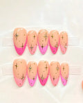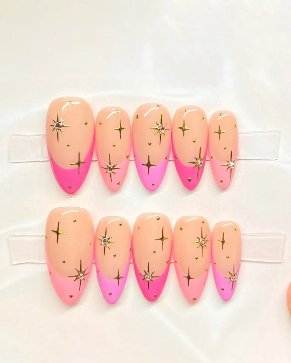 Handmade Pink Ombre Star Gold Celestial French Tip Press on Nails O02