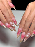 Handmade Pink Ombre Sweet Heart Gold Drip Metallic Charm Press on Nails Y38