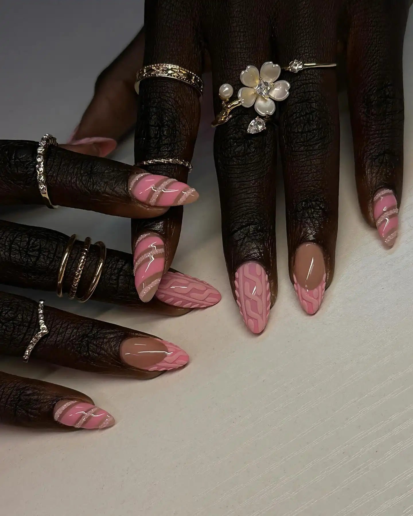 Handmade Pink Sweater Texture and Glitter Stripe Design Press on Nails Q14