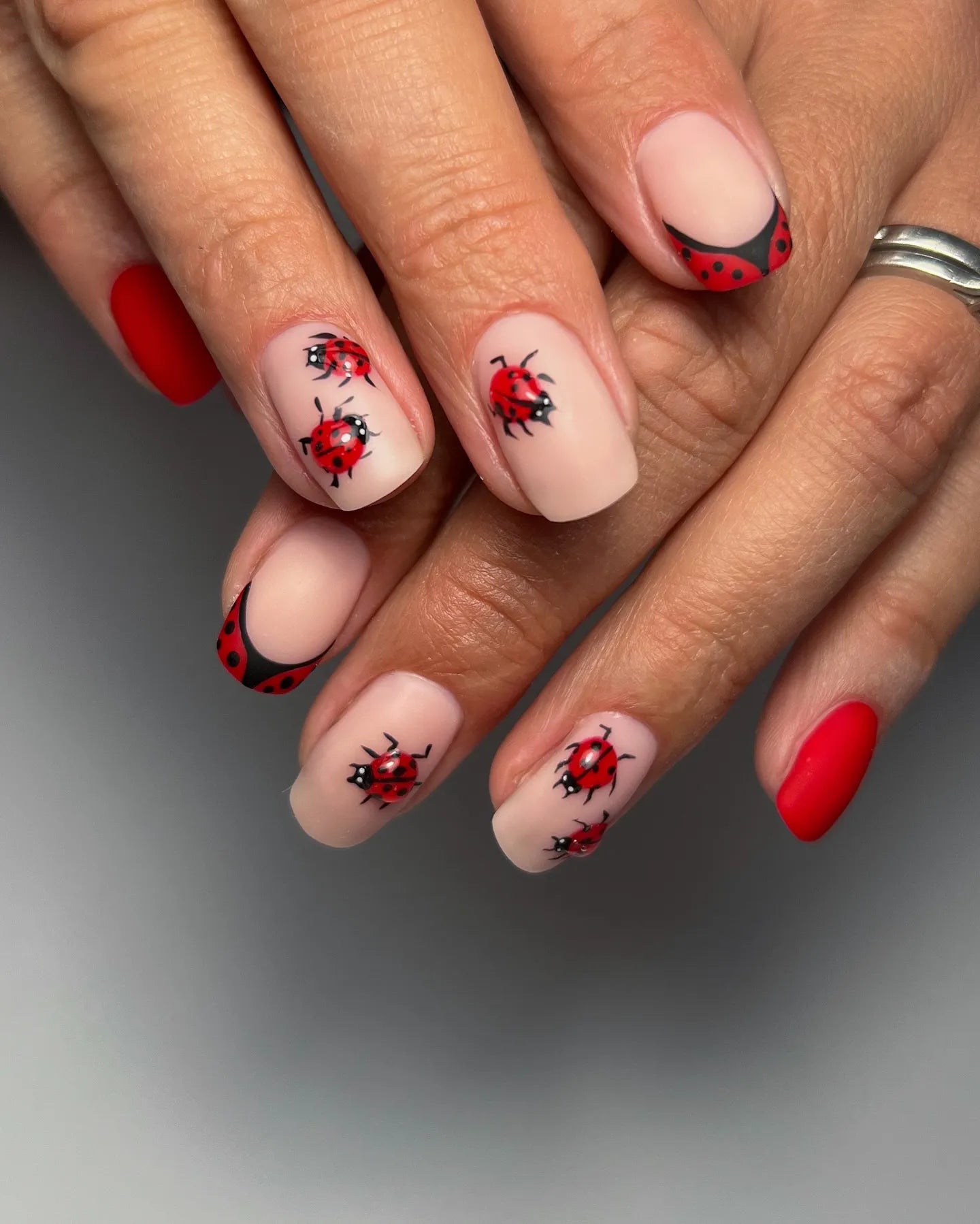 Celebrate nature with these charming handmade press-on nails. Featuring vibrant hand-painted ladybugs crawling across a soft nude base, this set is accented by bold red nails and ladybug-patterned French tips. These reusable fingernails offer a customizable, playful aesthetic with a professional glossy finish. Bring a touch of garden magic to your manicure with this sweet ladybug set today!