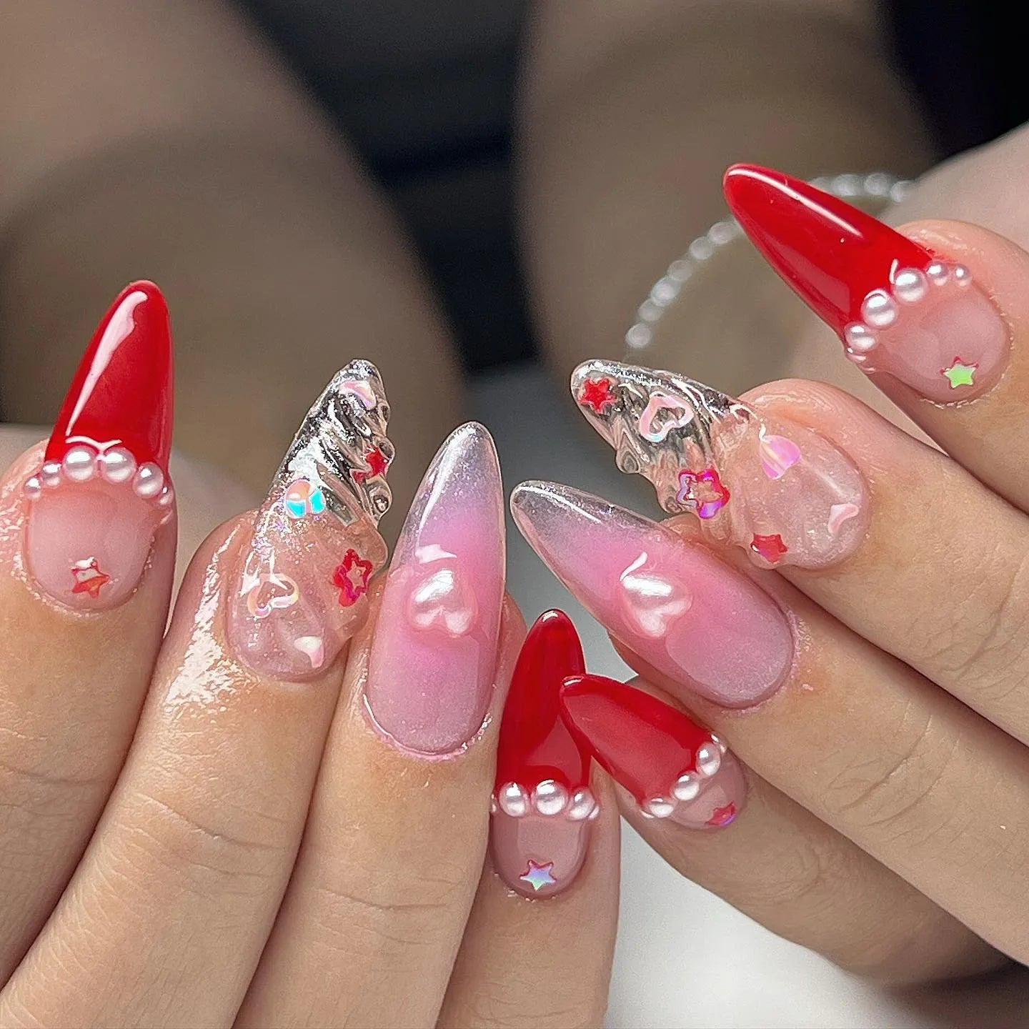 Handmade Red Love Heart Star Pearl Press on Nails X50