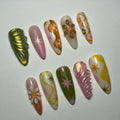 Channel vintage vibes with these handmade, reusable press-on nails! Enjoy a salon-quality look instantly and affordably. Featuring vibrant pinks, oranges, and greens in a psychedelic glossy finish with '60s flower power and swirly patterns, these nails are perfect for any event or daily wear. Shop now and feel the groove!