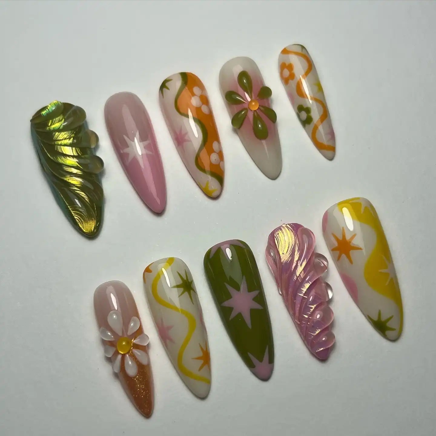 Handmade Retro Flower Star Swirl Pink Orange Green Press on Nails W69