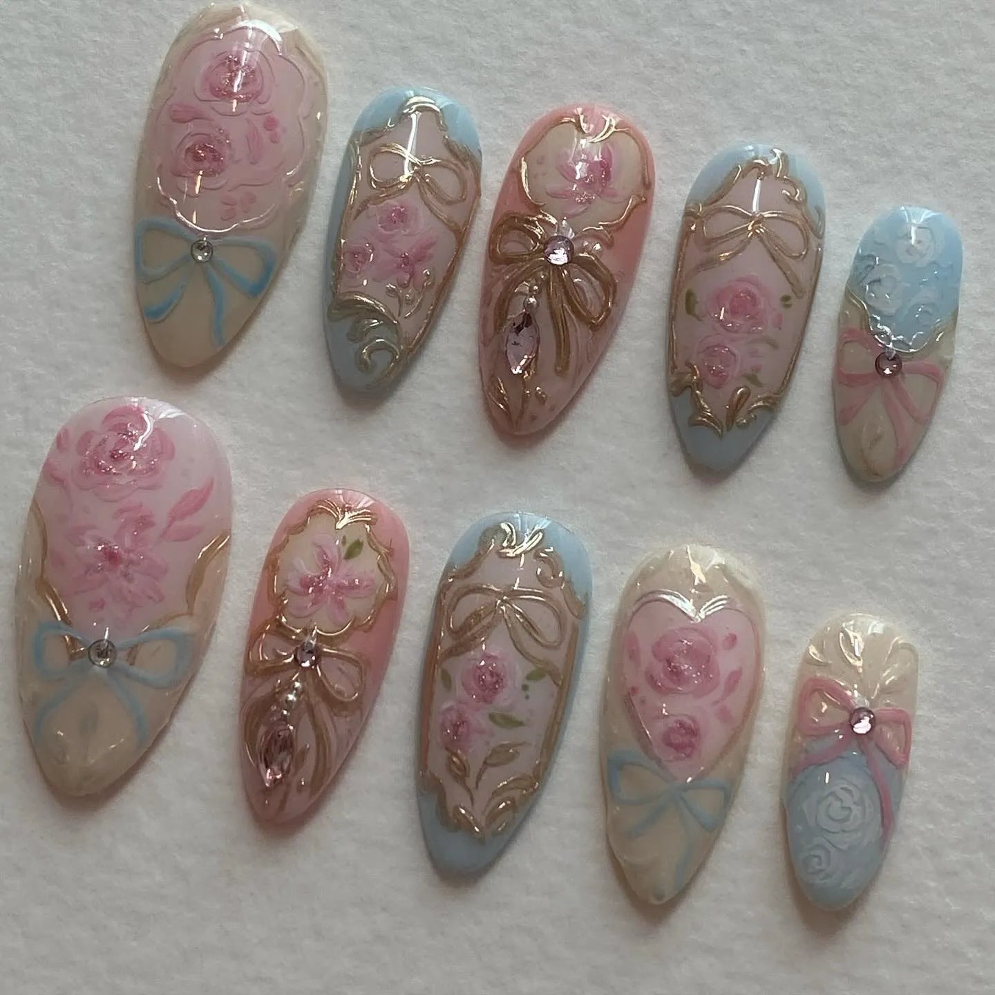 Indulge in a romantic fantasy with these exquisite handmade press on nails, featuring pink roses, delicate bows, and framed borders. These reusable fingernails offer customizable designs and a glamorous, high-shine finish, making them perfect for any event or daily wear. Who would love these? Brides, attendees of elegant parties, or anyone who loves vintage aesthetics. They are available in many shapes and lengths, including Long, Coffin, or Square. Give yourself the gift of luxury and royal elegance with this beautiful set!