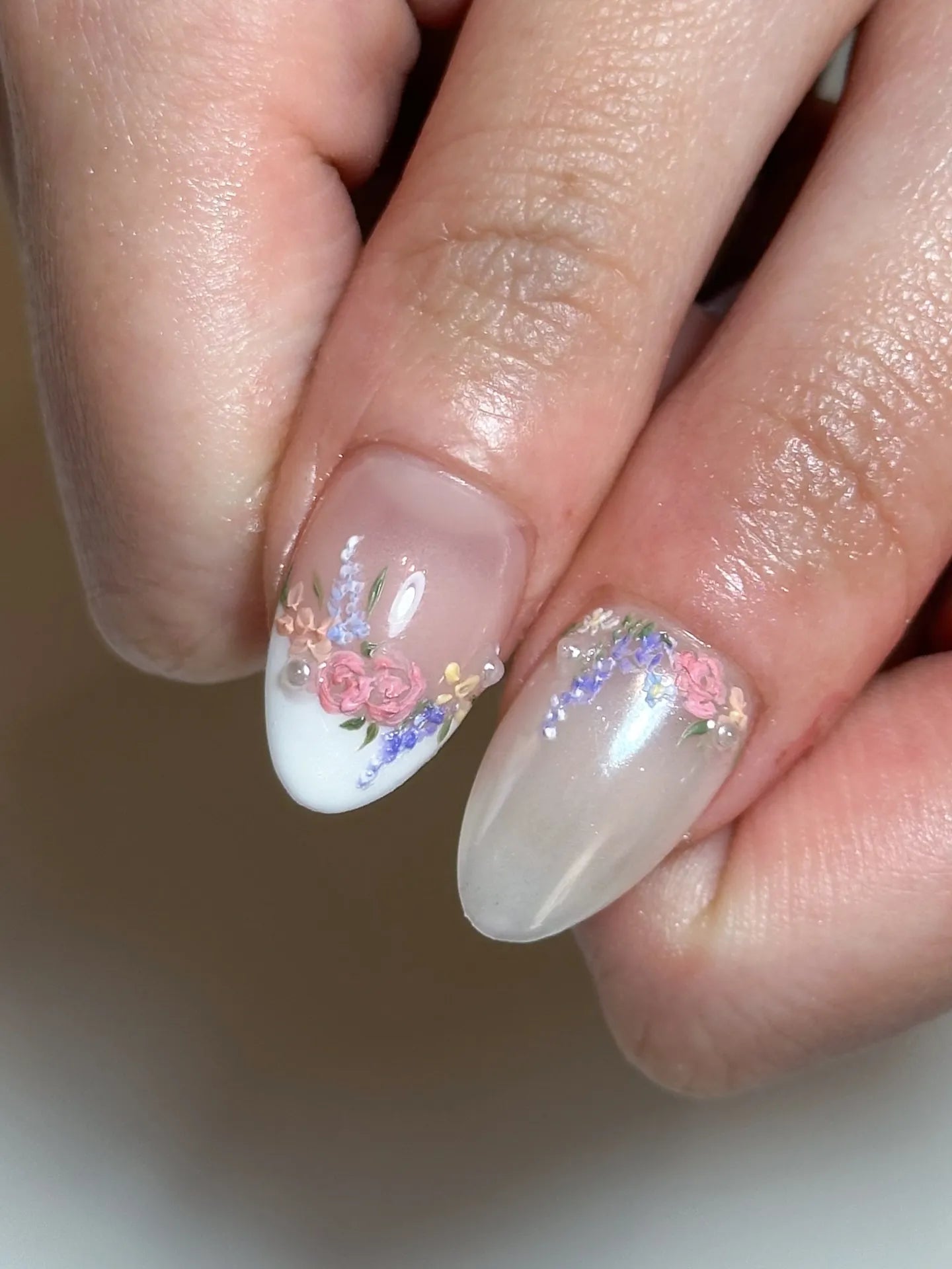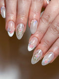 Elevate your look with these charming handmade press-on nails! Featuring customizable designs with soft pastel florals, delicate gold frames, and a classic white tip, these reusable fingernails offer a sophisticated finish. Ideal for bridal events, garden parties, or any event or daily wear, this set exudes elegance. Available in many shapes like Oval or Almond, and various lengths. Experience timeless beauty effortlessly. Add this elegant set to your cart!