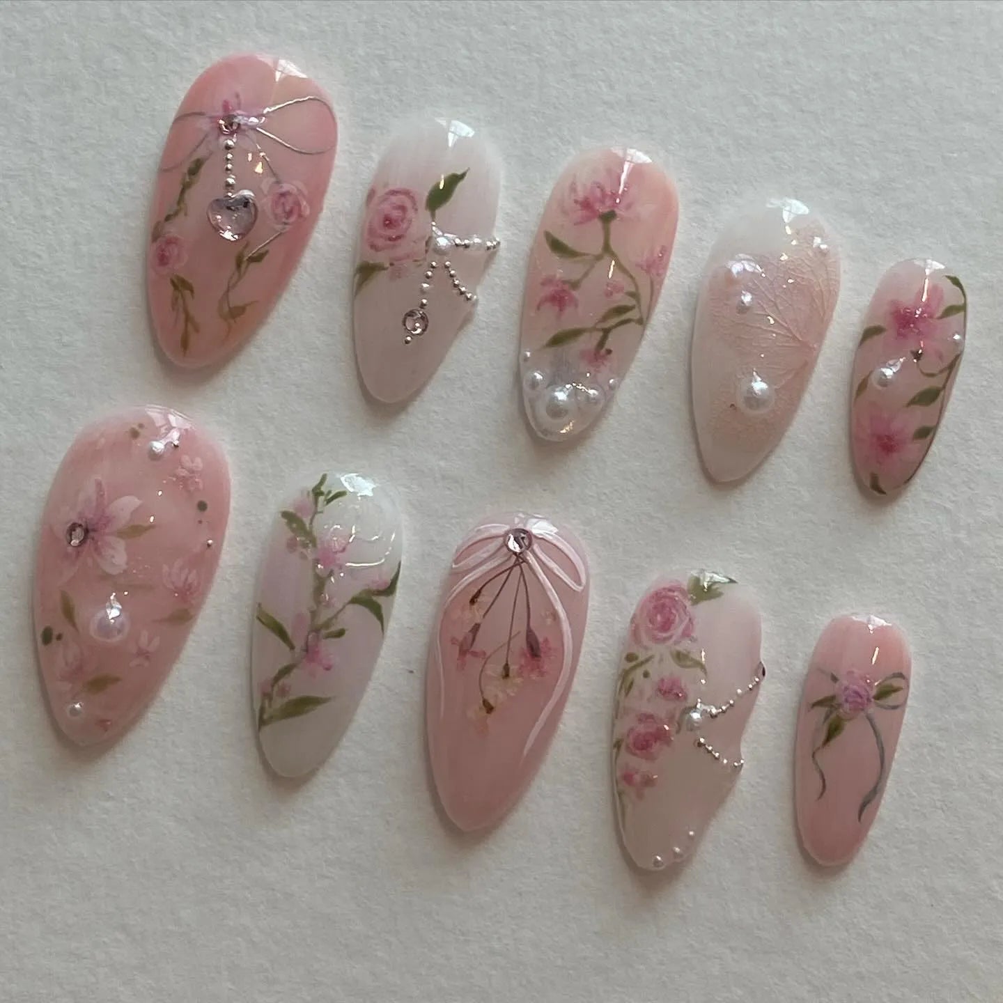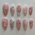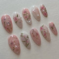 Begin your day with beauty wearing these exquisite handmade press on nails, showcasing soft pink roses, delicate floral vines, and shimmering pearl accents. These reusable designs, with a high-shine finish, offer customizable designs and are perfect for any event or daily wear, giving your fingernails an extra touch of charm. They are available in many shapes and lengths, including Medium, Almond, or Oval. Ideal for spring holidays, romantic dates, or anyone who loves refined, feminine, and whimsical style. Transform your manicure with this stunning and unique floral set today!