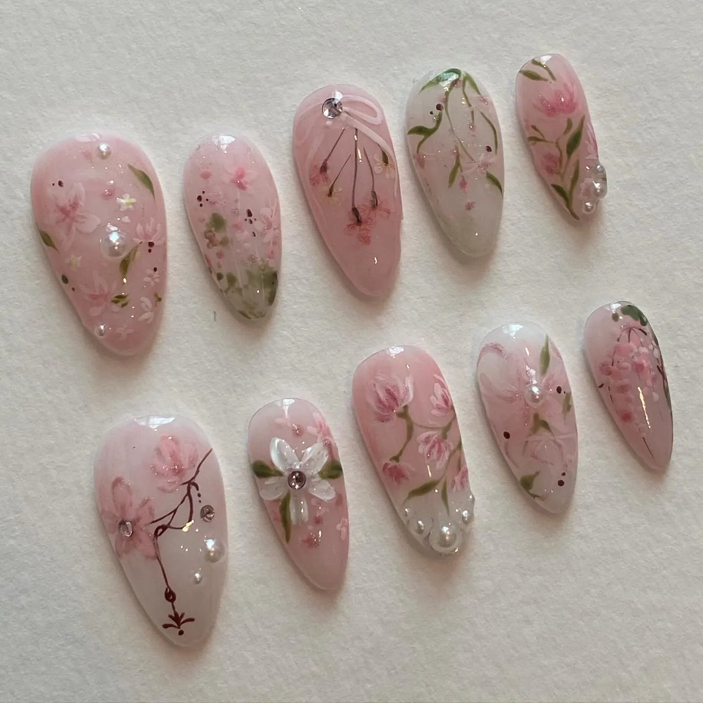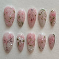 Handmade Romantic Soft Pink Floral Cherry Blossom Pearl Rhinestone Gel Nails R44