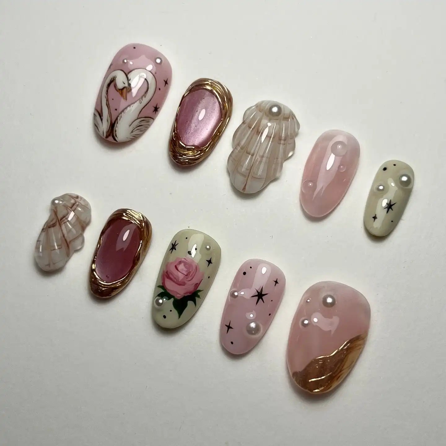 Elevate your look with these exquisite handmade, reusable press-on nails! Experience effortless beauty with a touch of elegance. Featuring delicate swans, romantic roses, shimmery pearls, and beautiful gems, these nails boast a stunning finish perfect for any event or daily wear. Their unique, intricate artistry sets them apart. Available in many customizable designs, various lengths (Short, Medium, Long) and shapes (like Almond or Coffin), they transform your fingernails in minutes. Get yours now and feel fabulous!